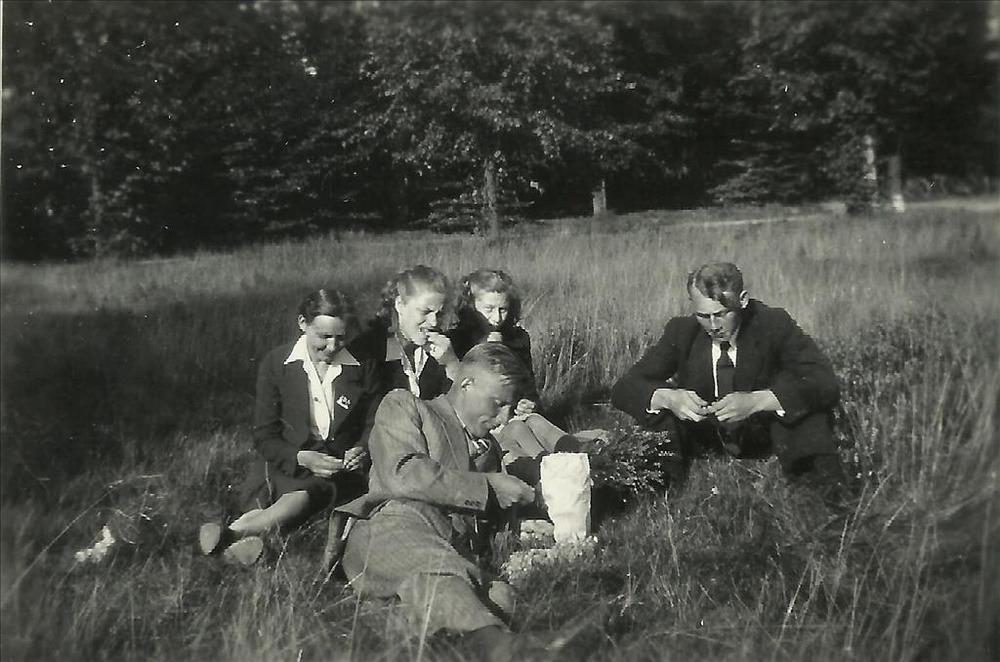 drie jonge vrouwen en twee mannen, picknick in het gras