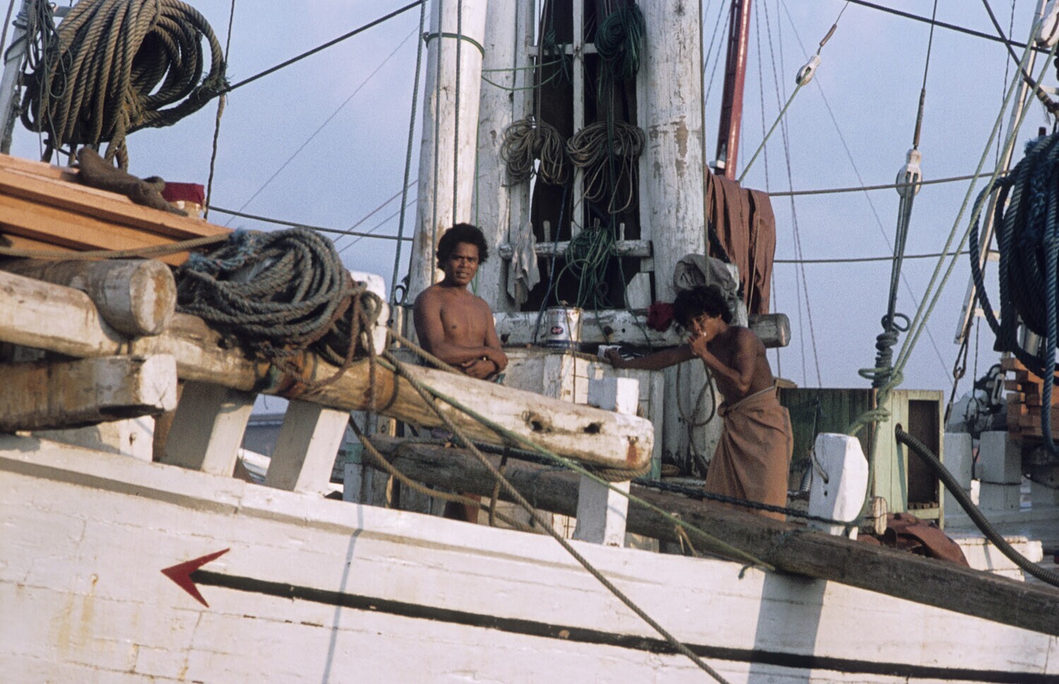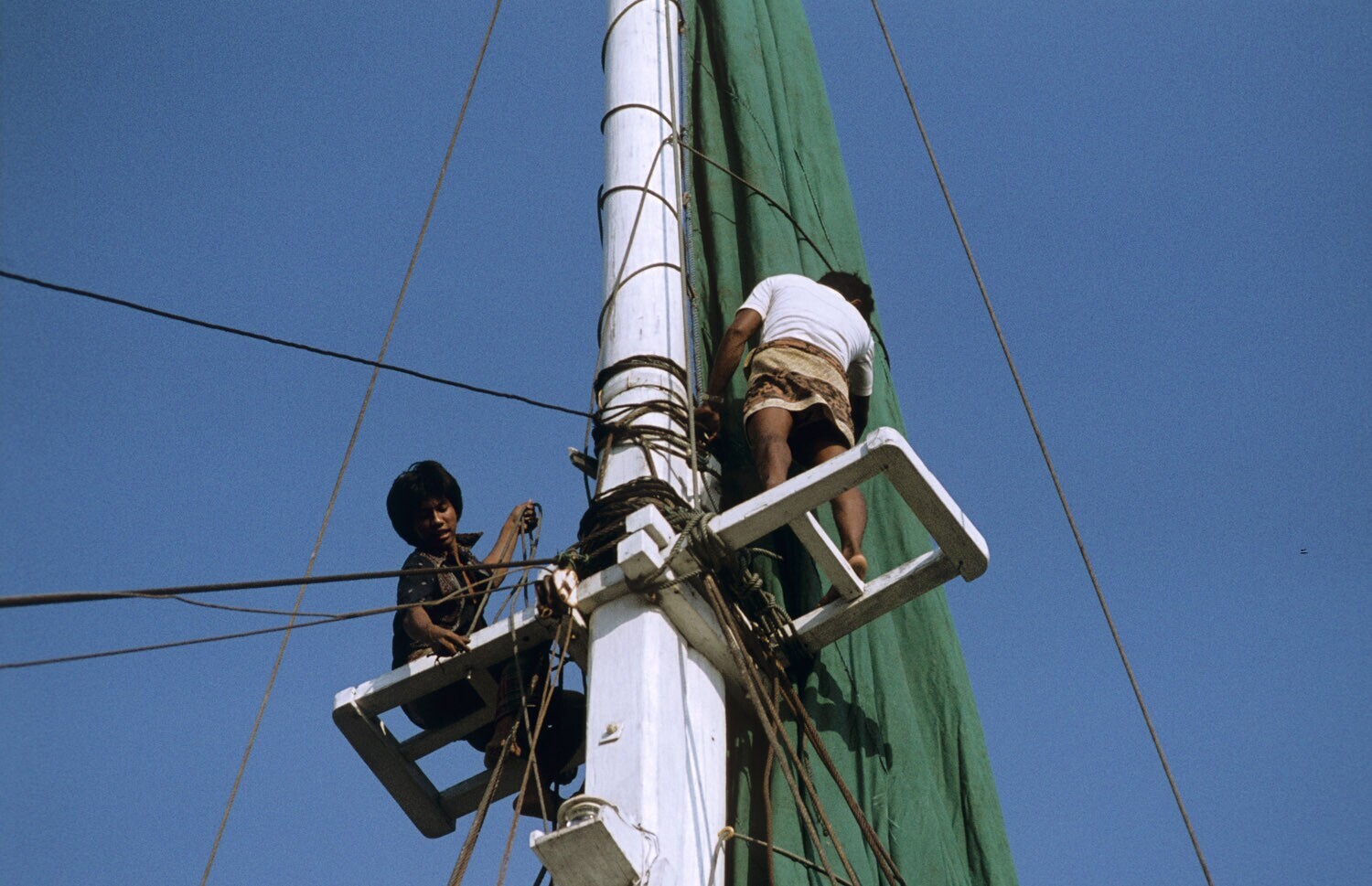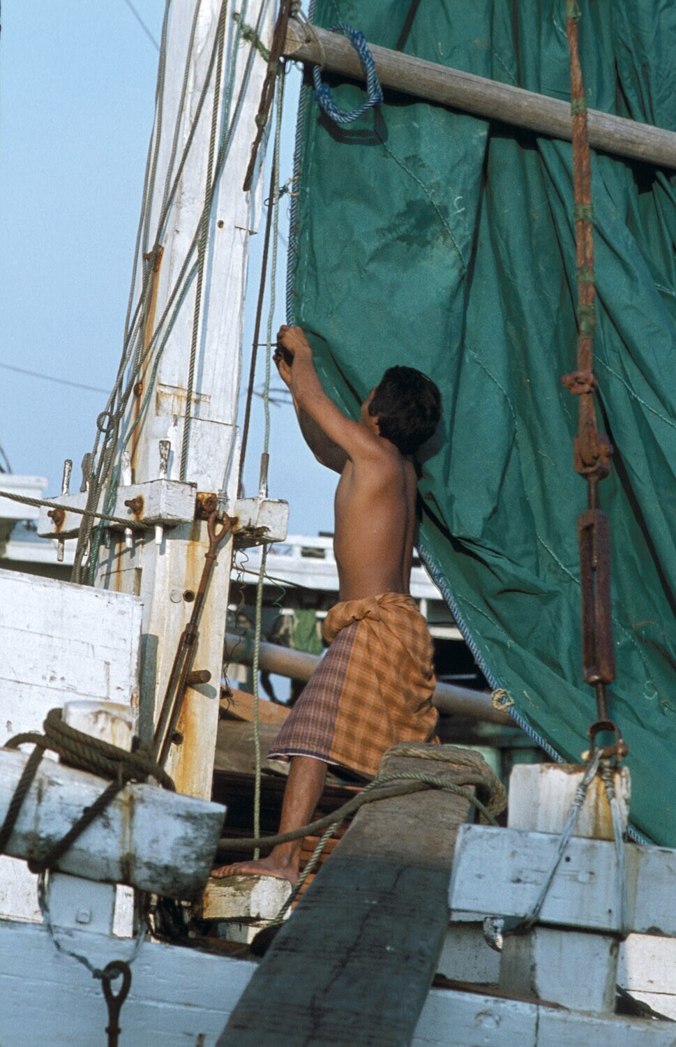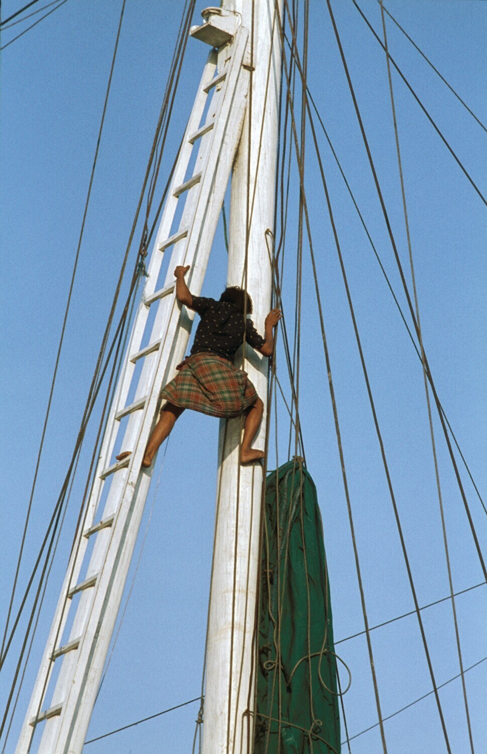 Climbing up the mast of a Buginese proa in Sunda Kel...