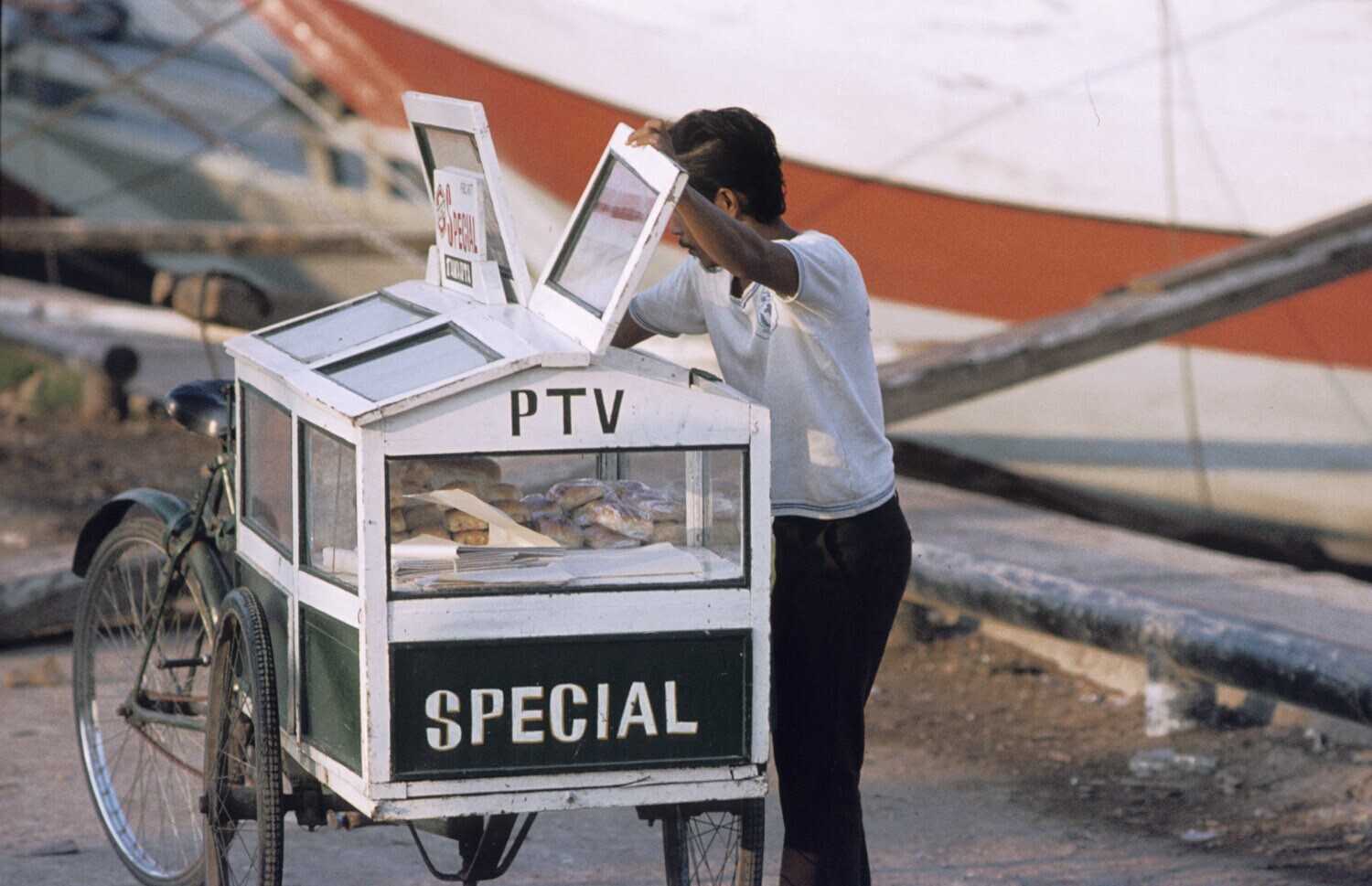 Een verkoper van etenswaren met zijn rijdende kraam ...