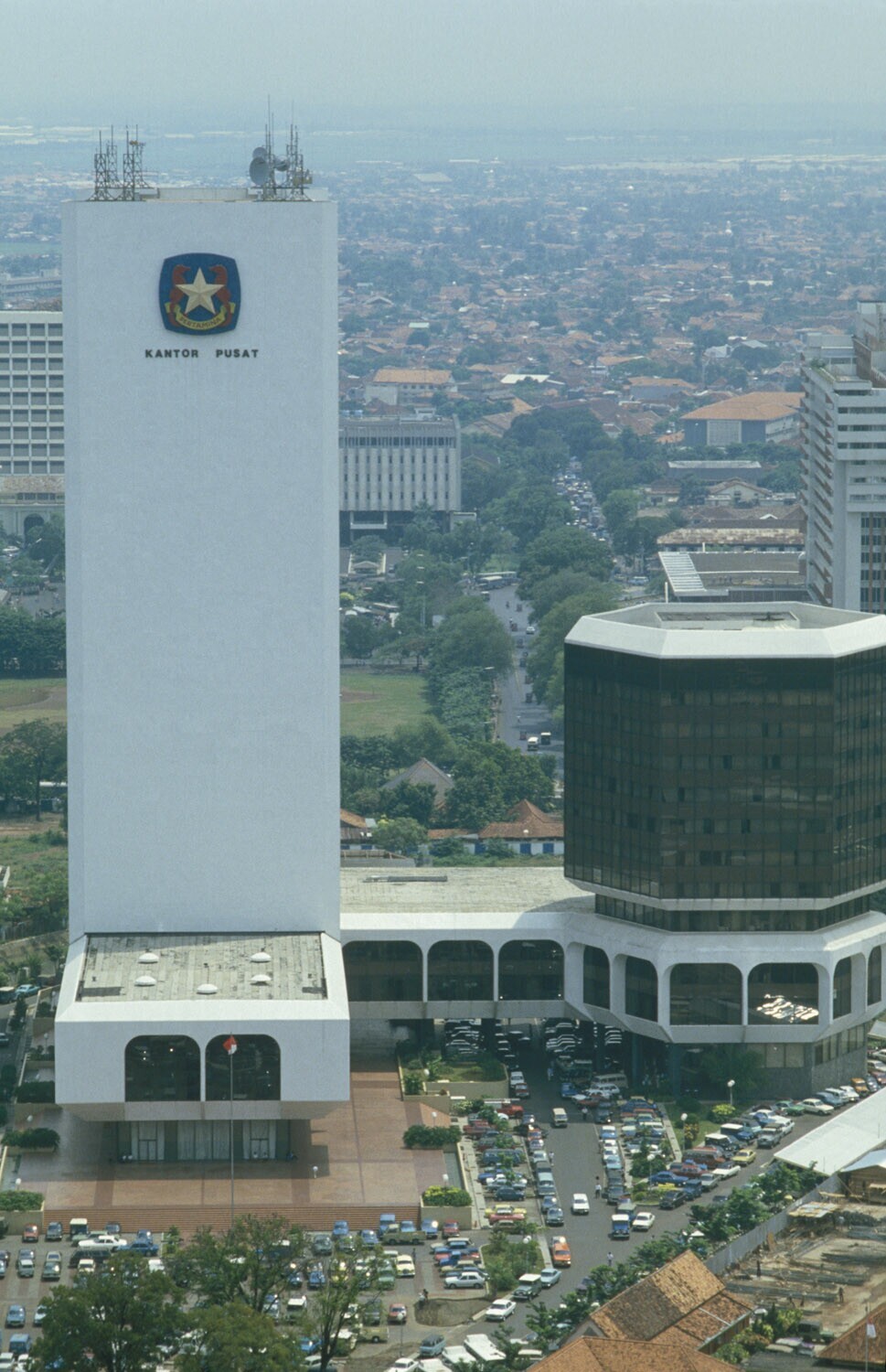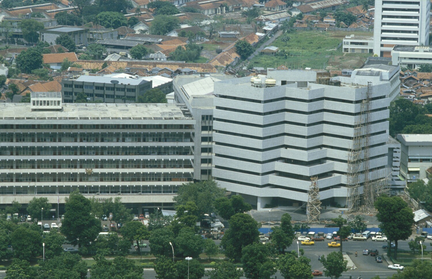 Gezicht op Jakarta met op de voorgrond het gebouw va...