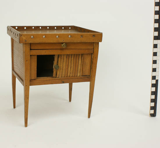 Nachtkastje met po, mangel met rol en hemelbed