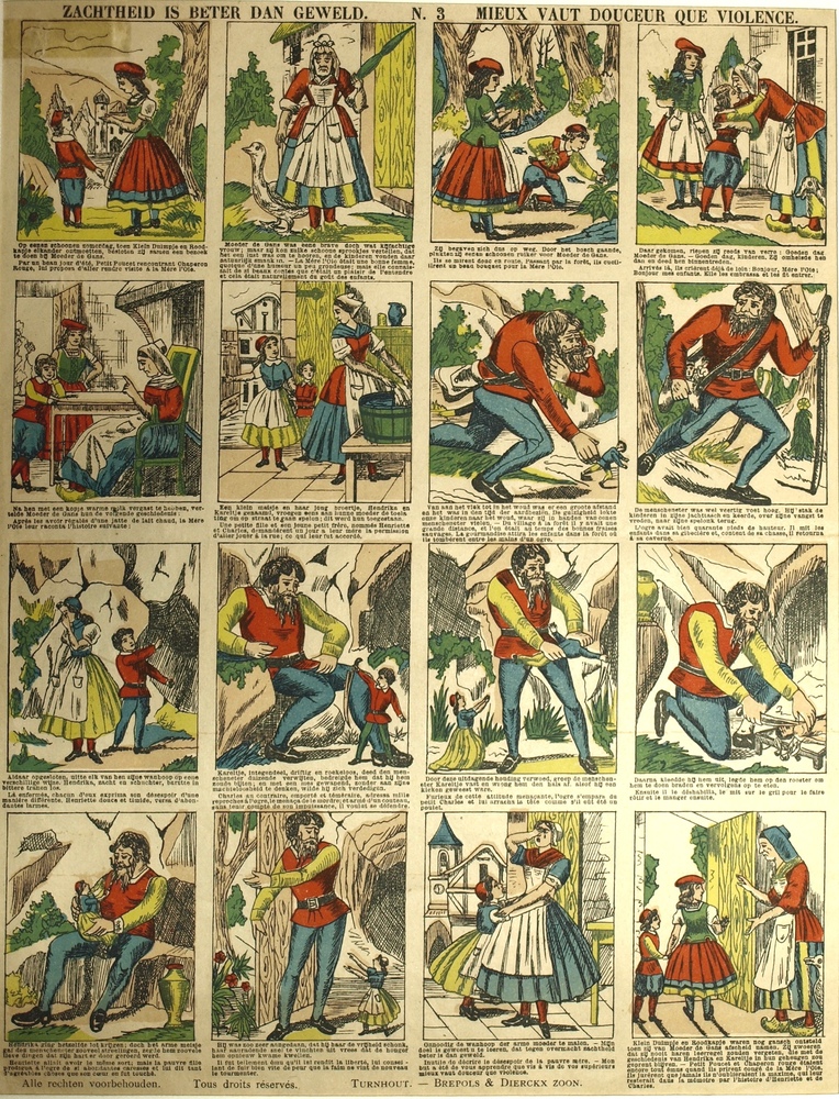 Centsprent met zestien gekleurde prentjes met het ve...