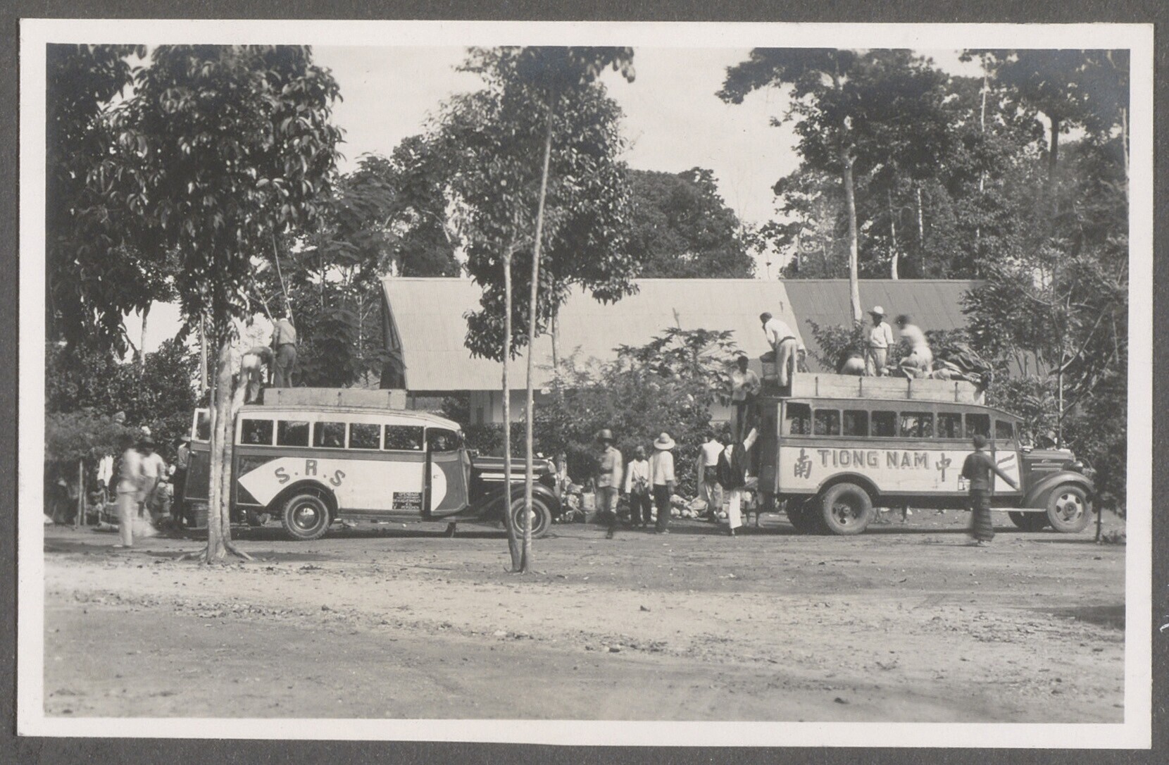 Passagiers stappen in autobussen van S.R.S en Tiong Nam