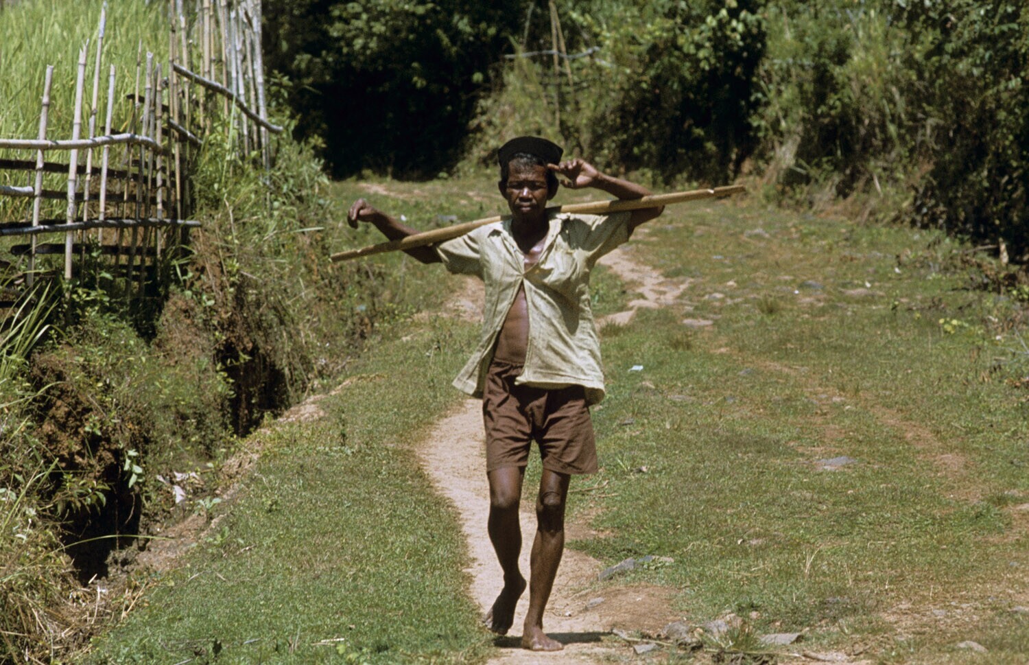 Onderweg naar Sodong, man met pikolan (=draagstok me...