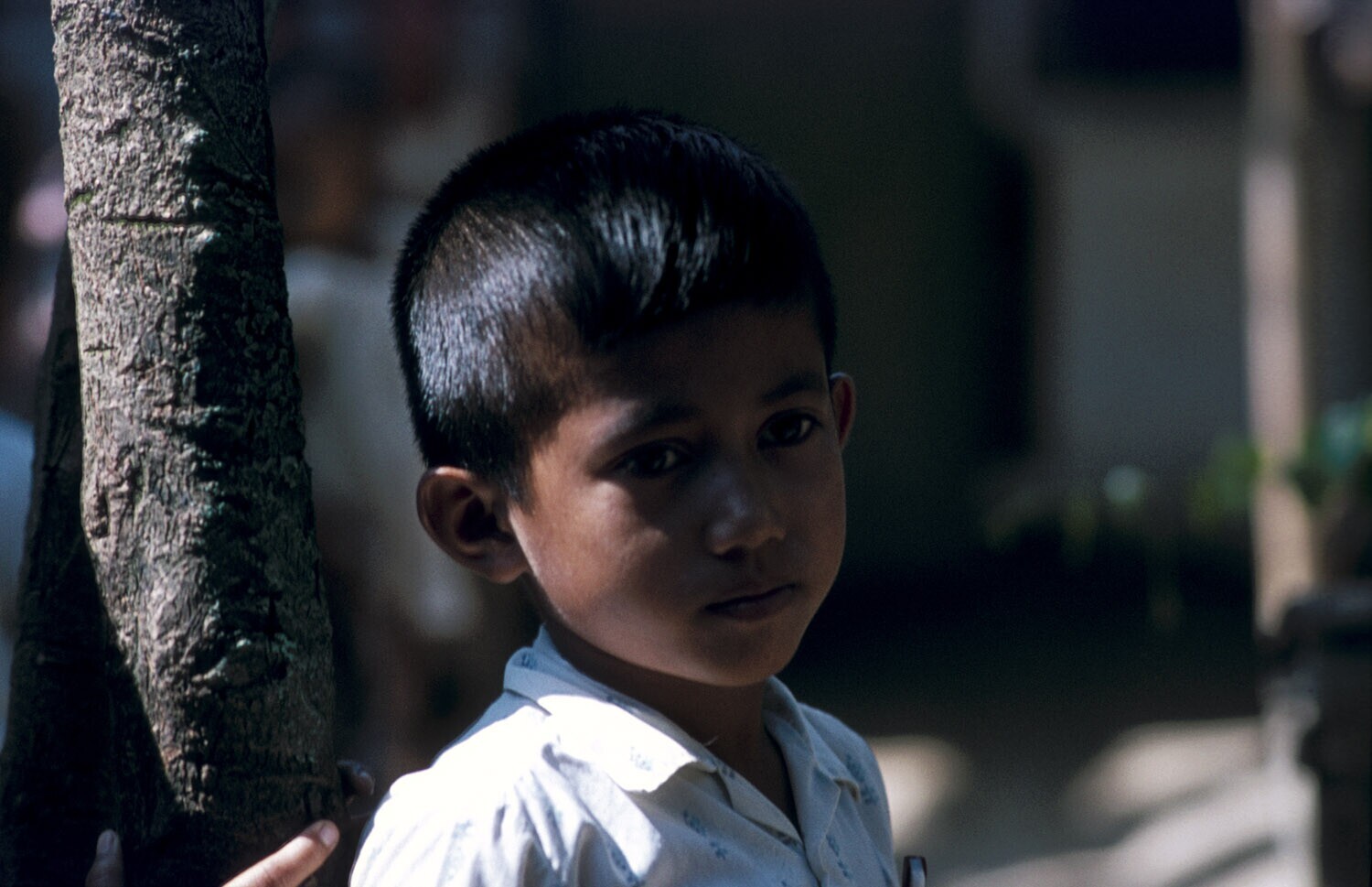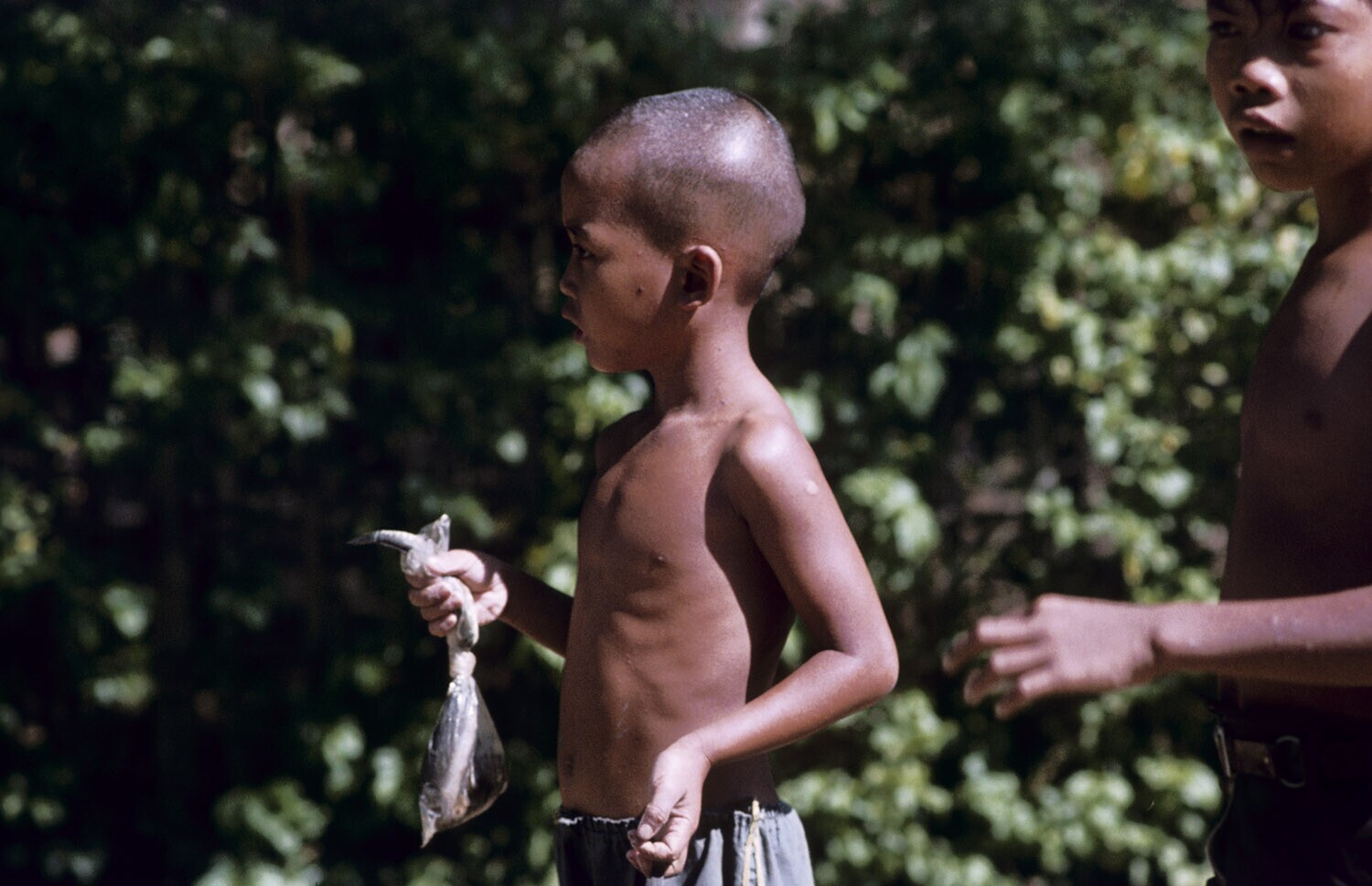 Jongetje met kaalgeschoren hoofd, op een klein stukj...