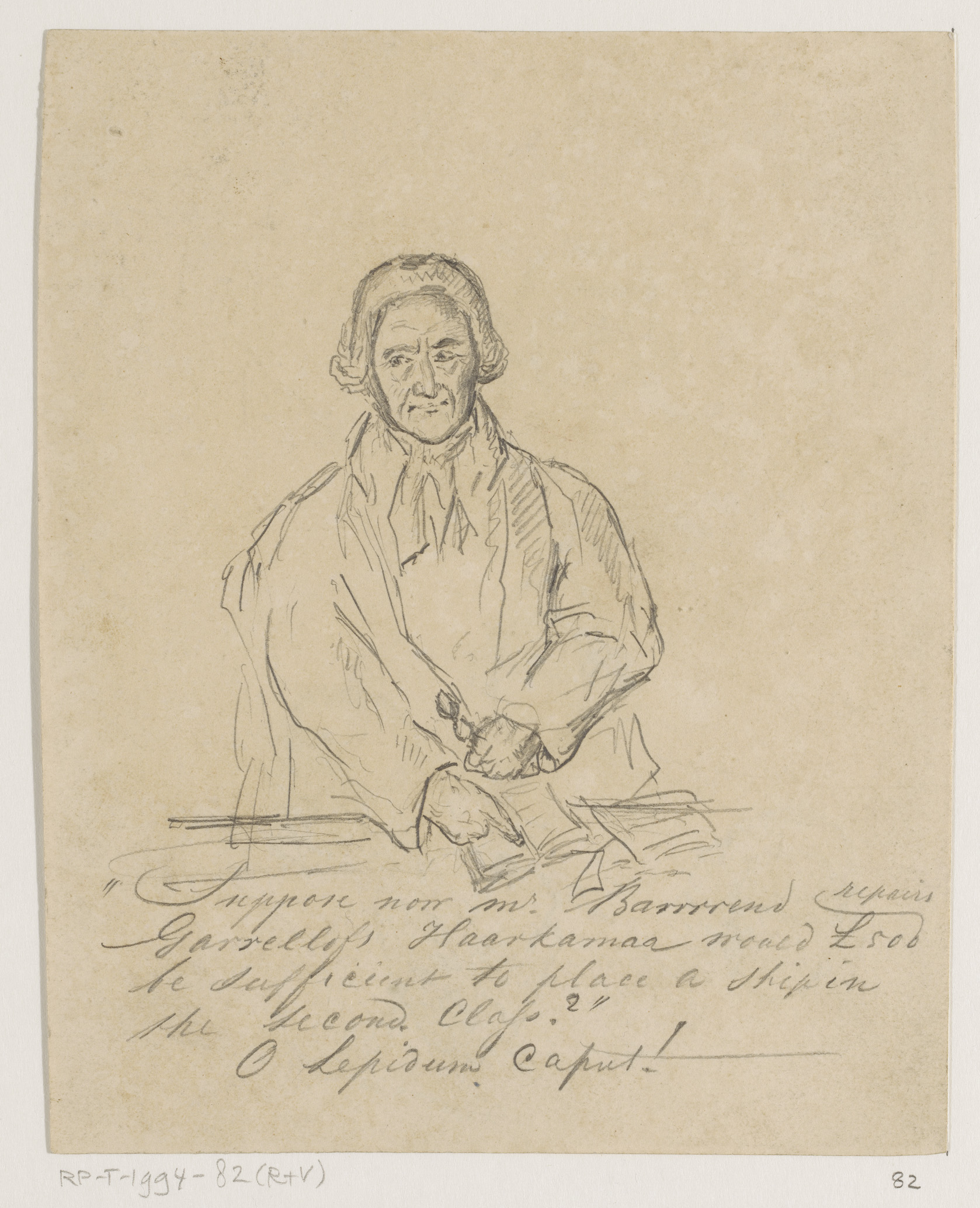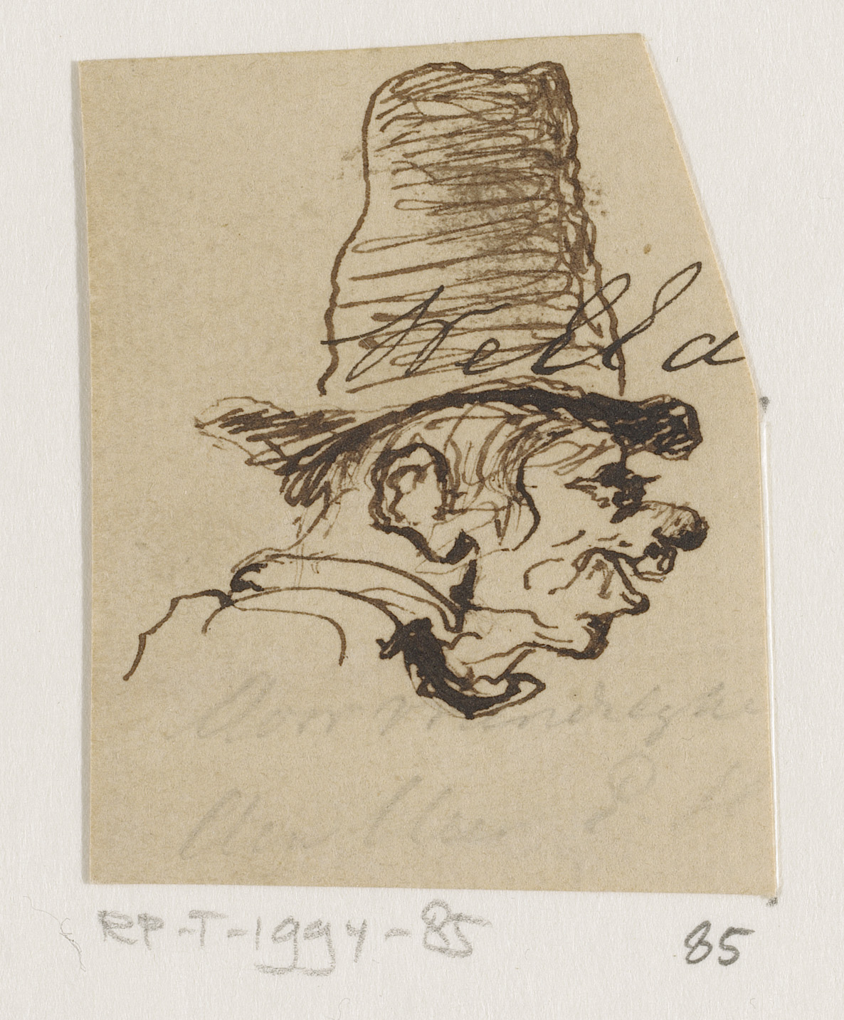 Karikatuur van man met hoge hoed, in profiel naar re...