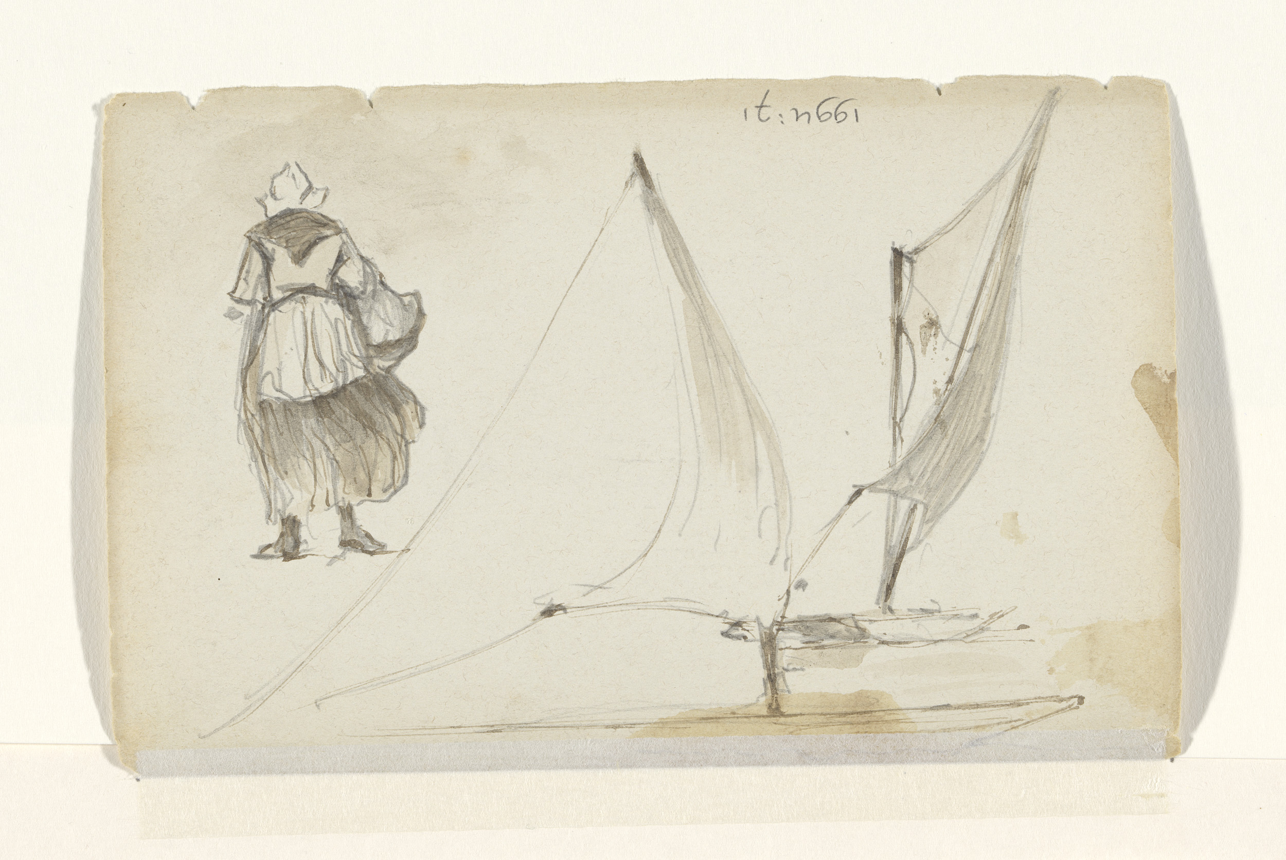 Studies van schepen en een vissersvrouw, op de rug g...