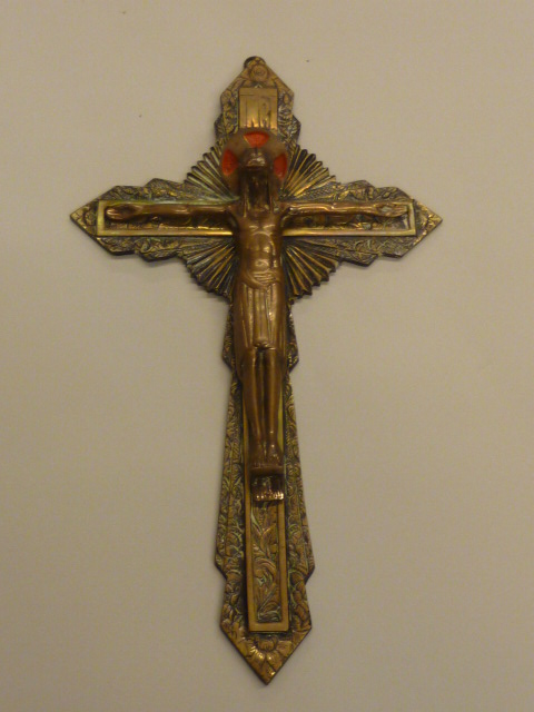 Christus aan het kruis waarop in reliëf INRI en flor...