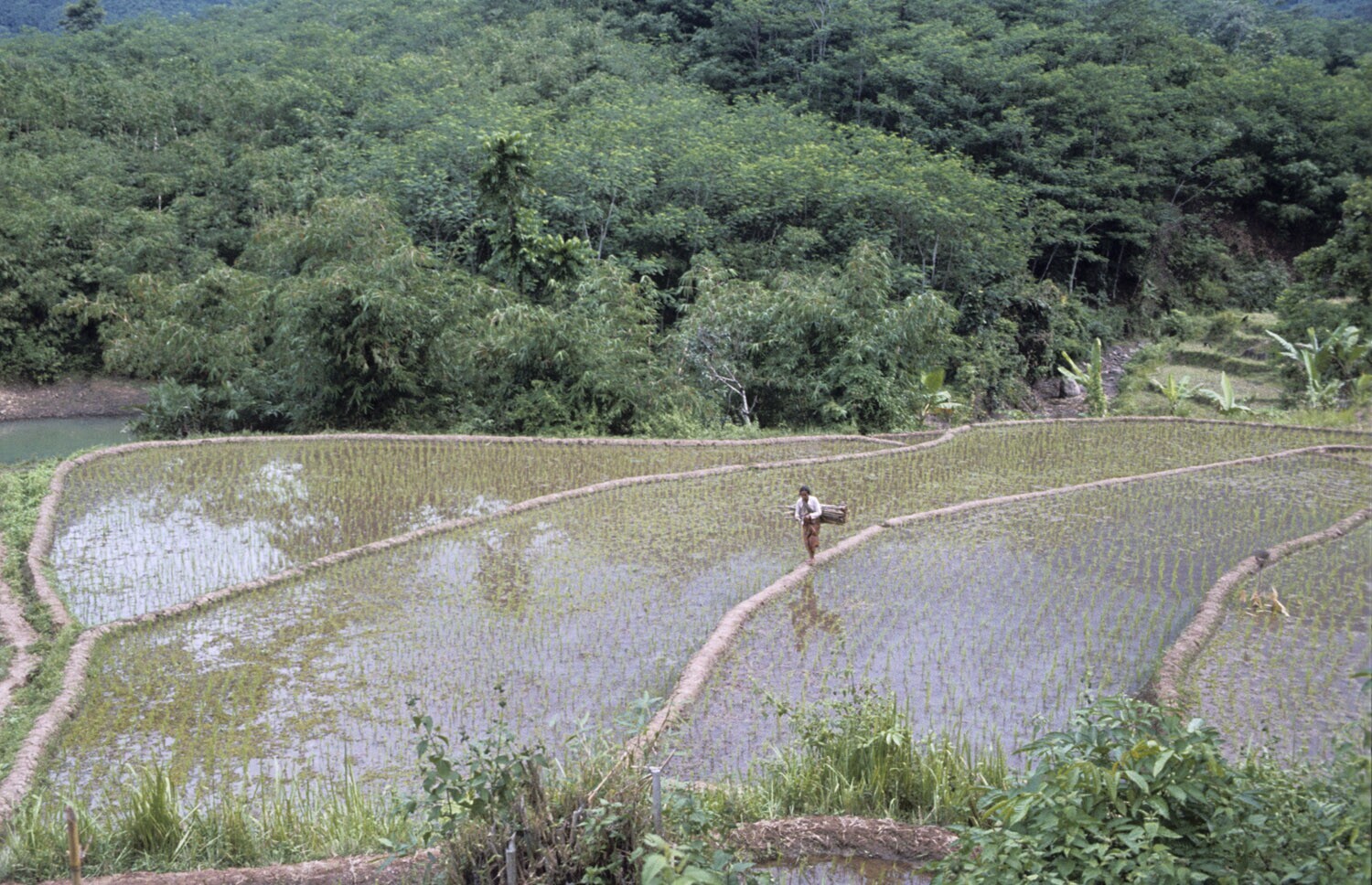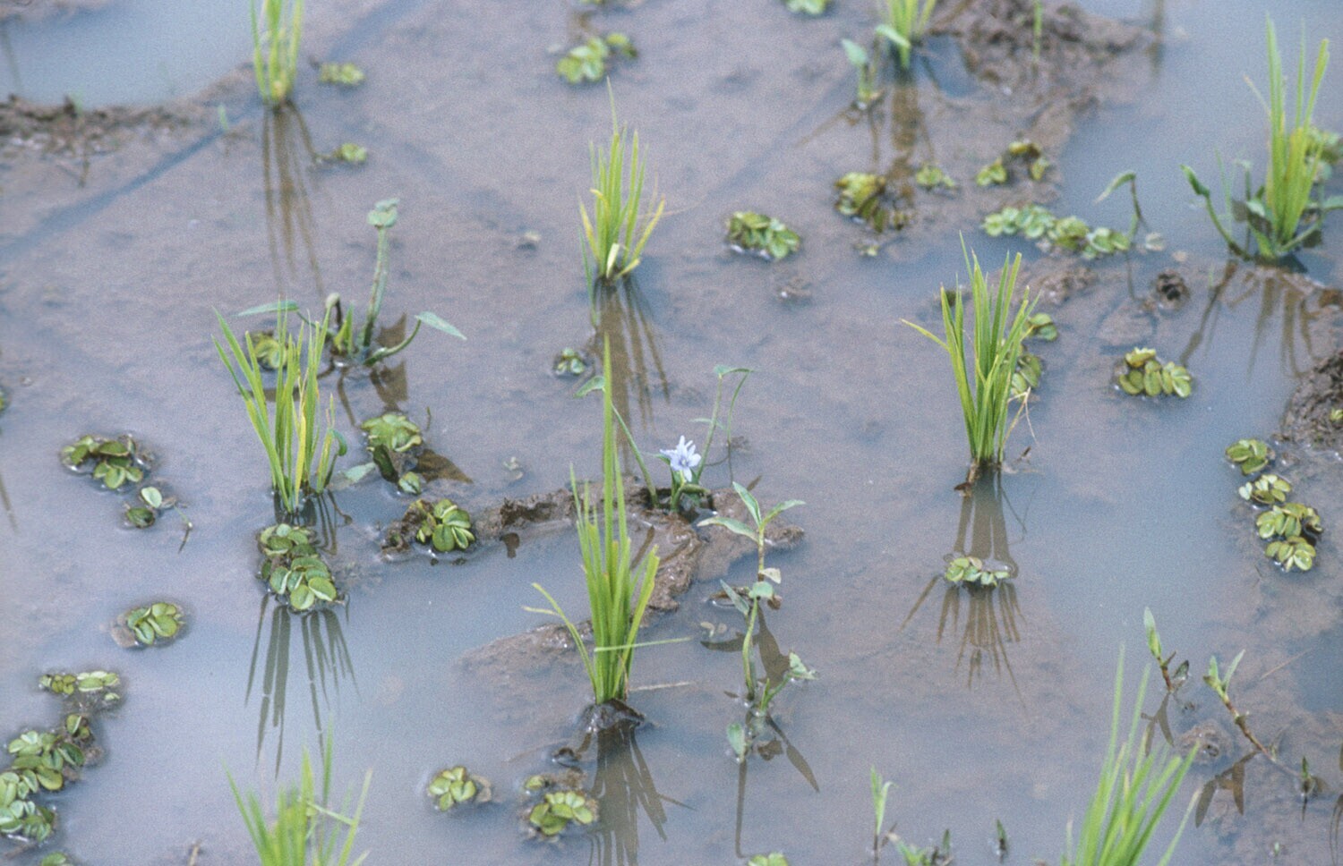 Bevloeid rijstveld voor de bewerking, op de weg naar...