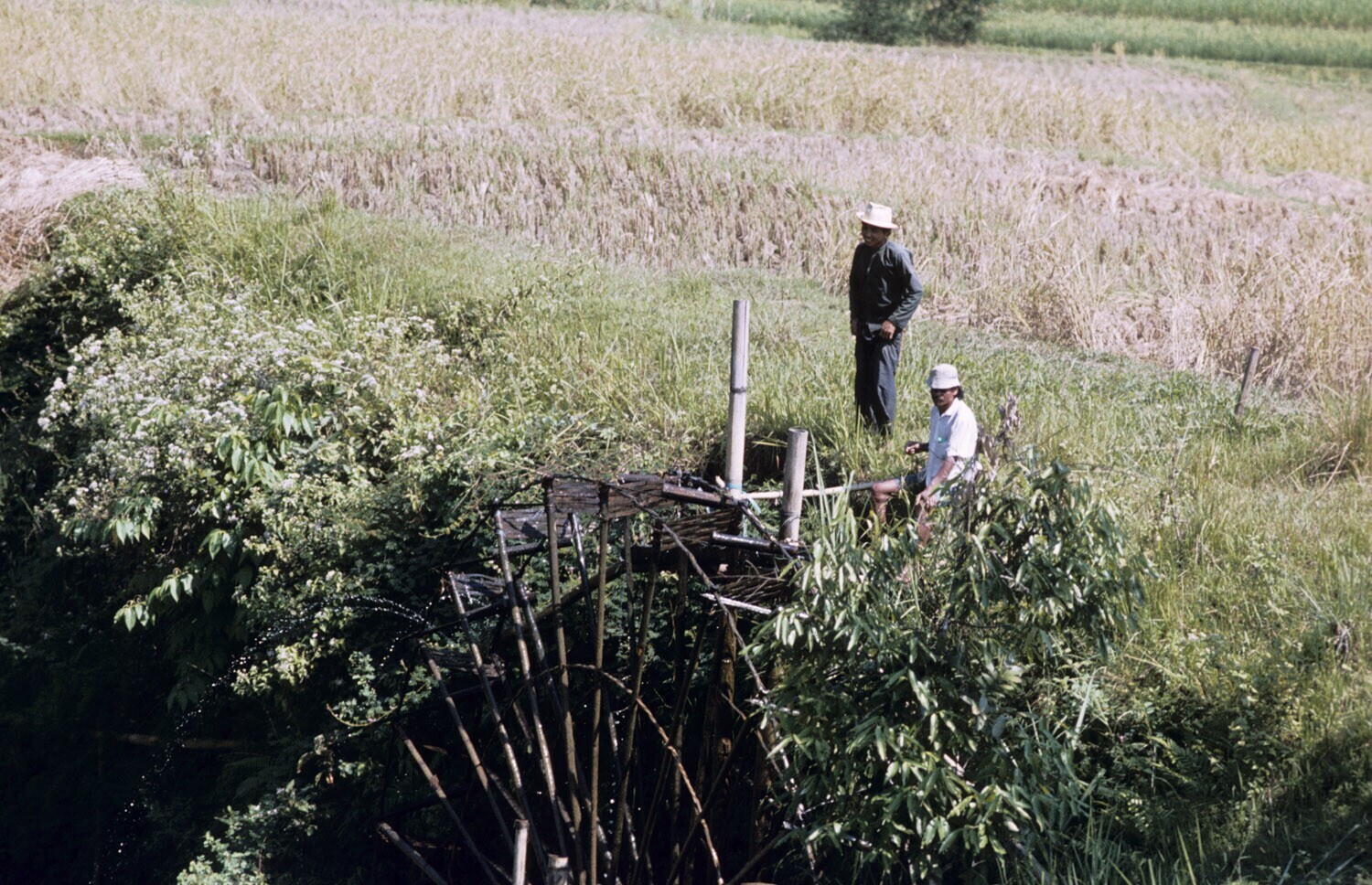 Bamboe-waterrad voor de bevloeiing van de rijstvelde...