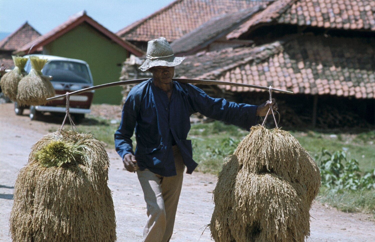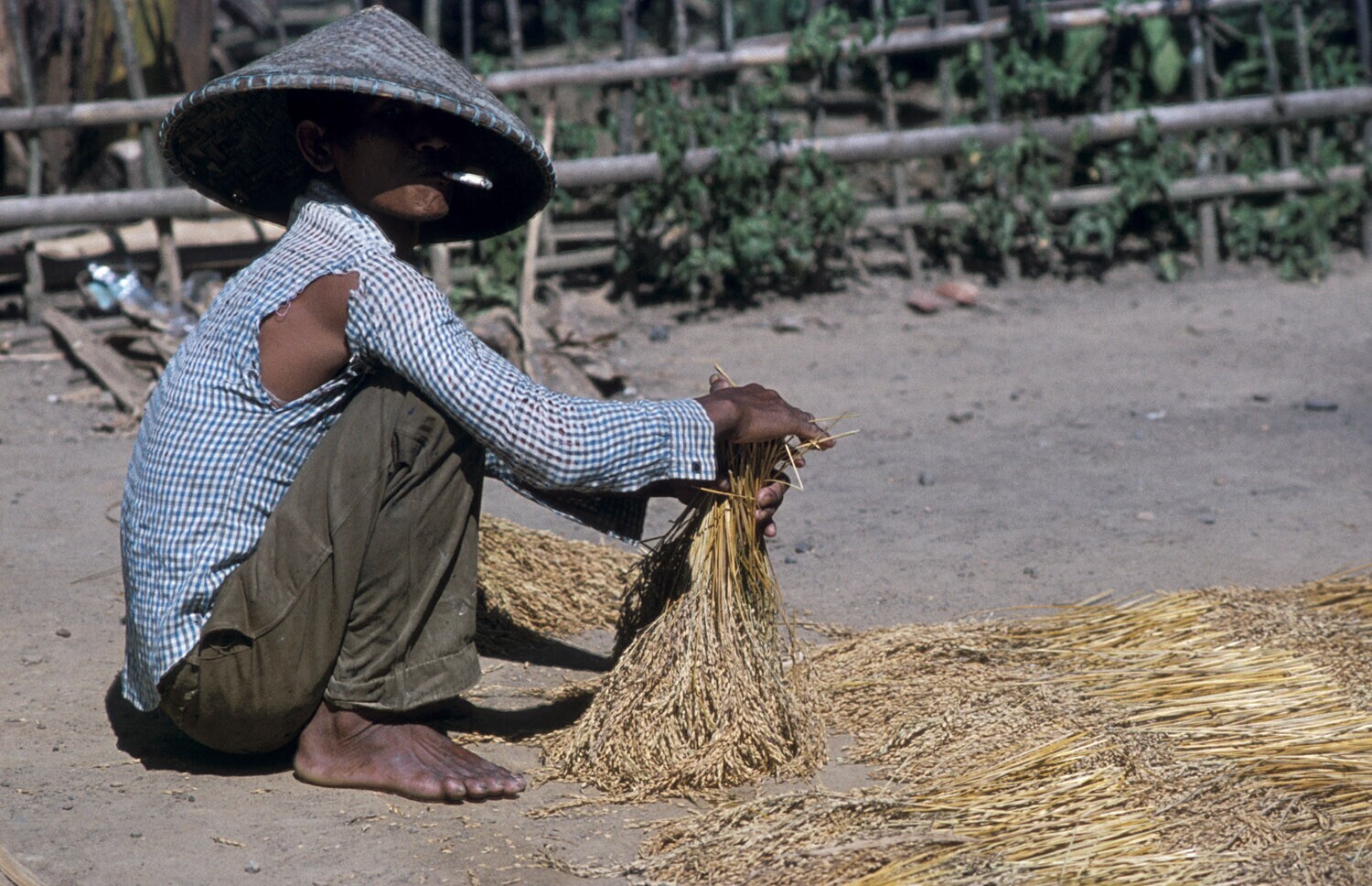 Man bundelt de rijstaren om in de zon te drogen, omg...