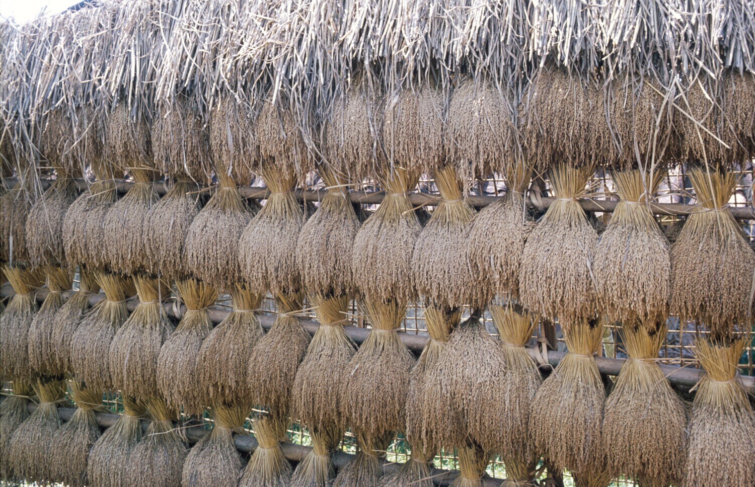 Gebundelde rijstaren hangen aan bamboestokken in de ...