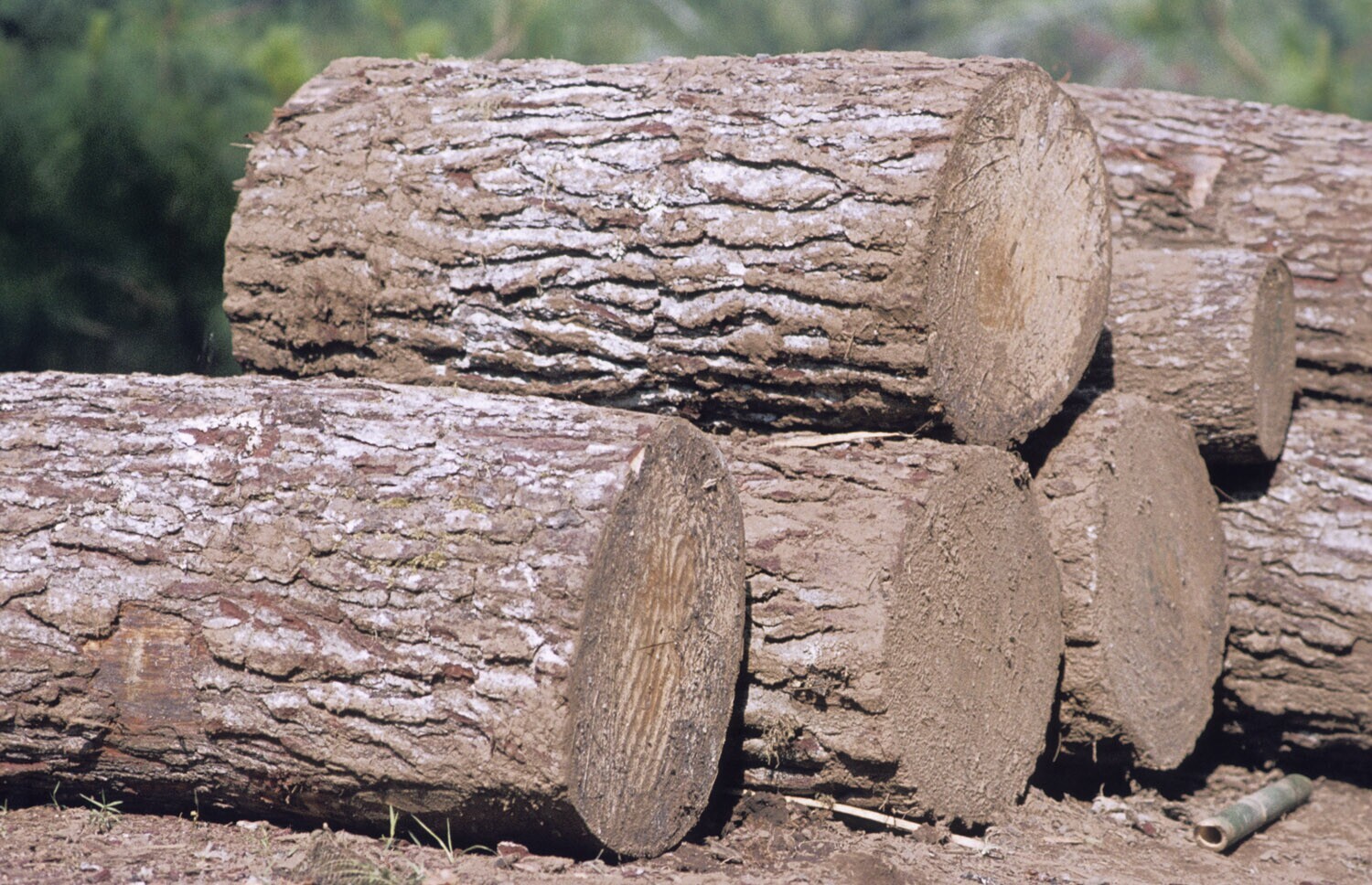 Gezaagde pinus (=den) stammen in het pinus-bos te Ba...