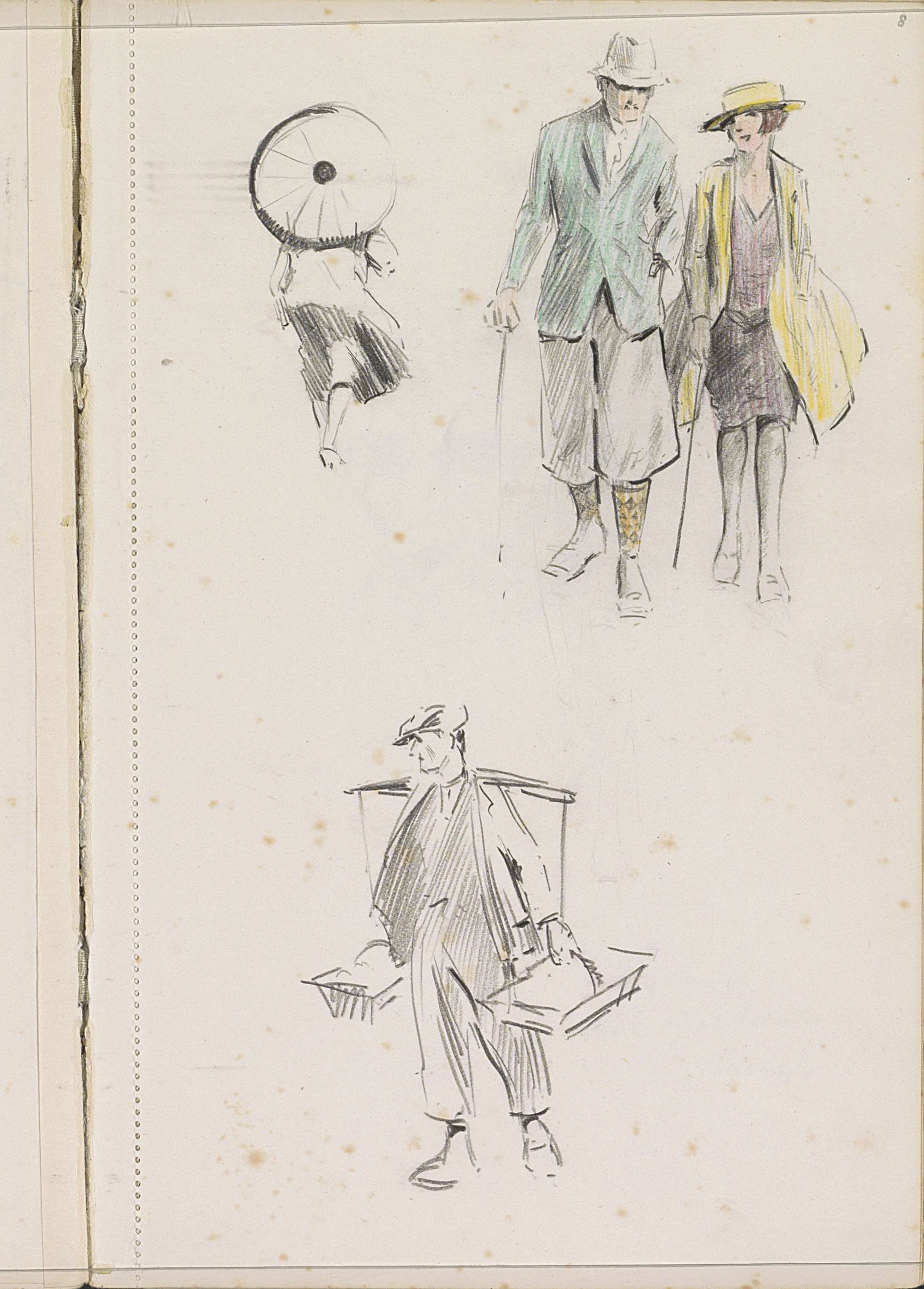 Vrouw met een parasol, man met een juk en een wandel...