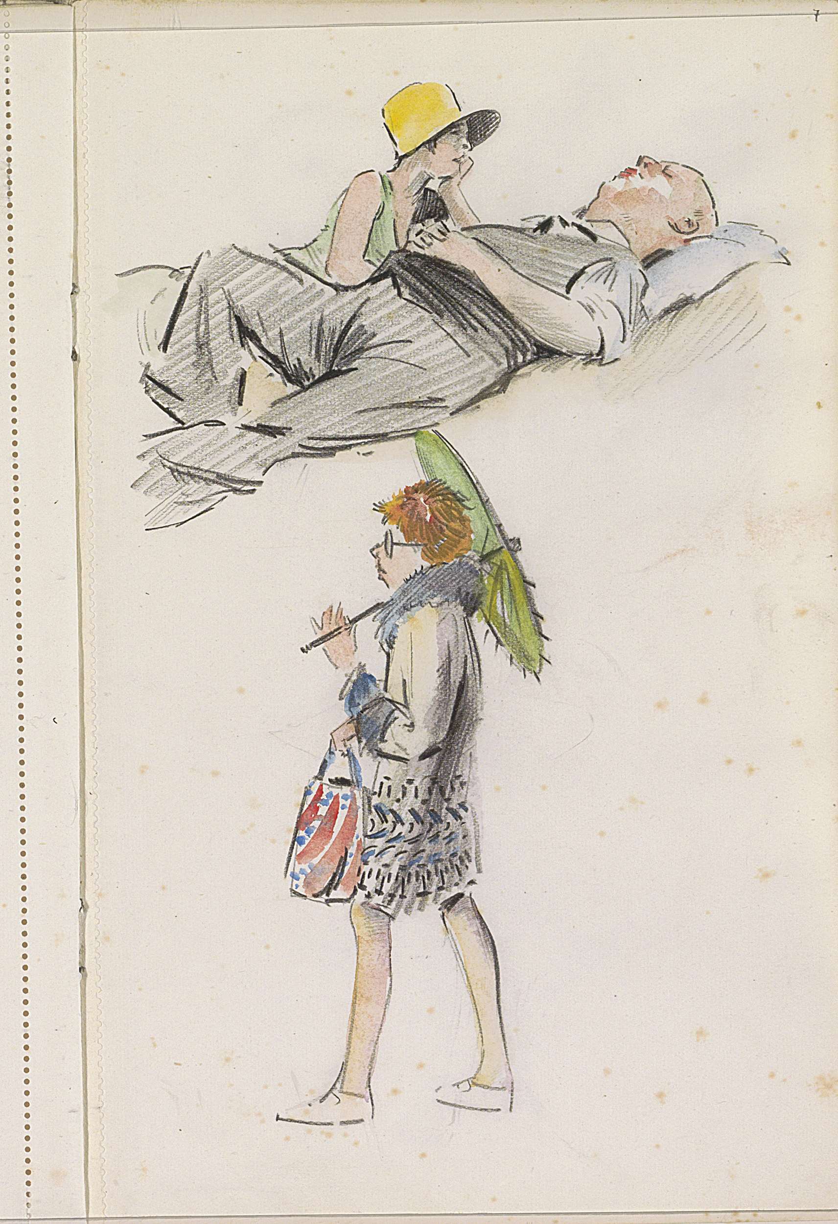 Liggend stel en een vrouw met een parasol