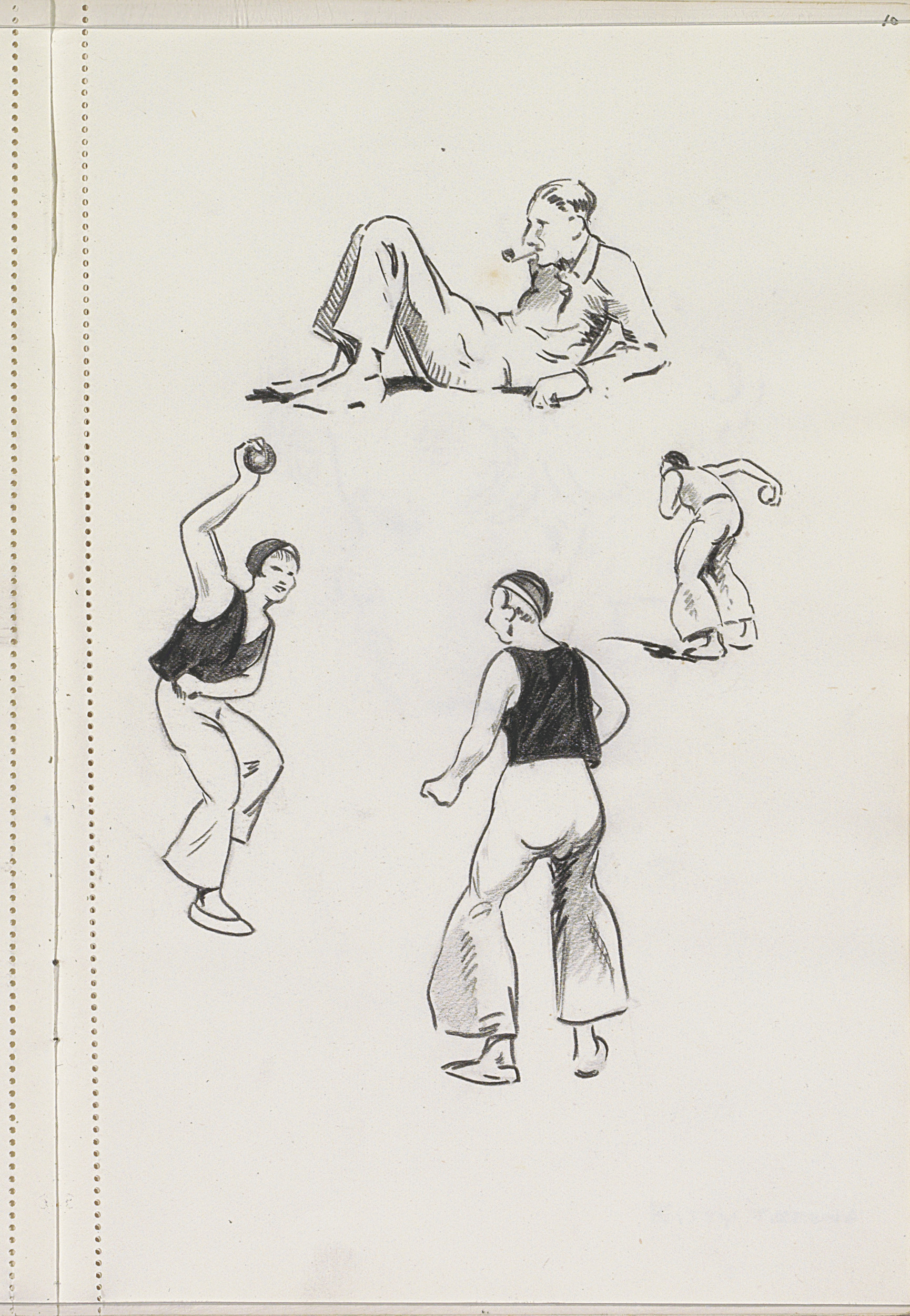 Sporters met een bal en een liggende man met een pijp