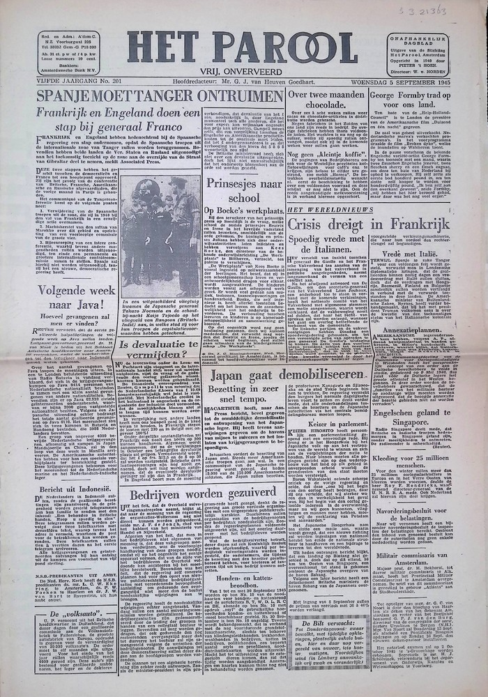 Het Parool, 5 september 1945, 5e Jaargang, No 201