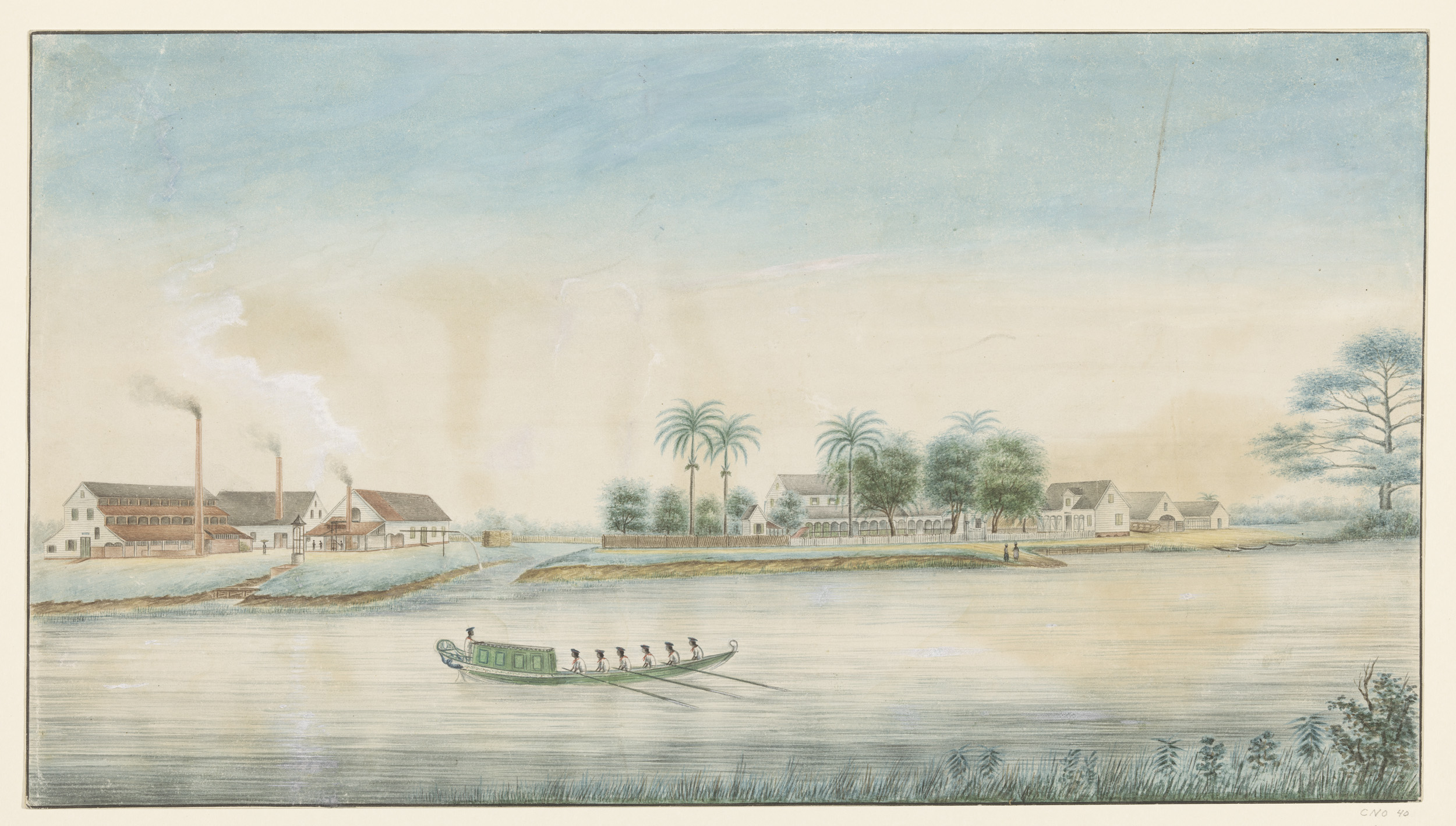 Gezicht op de suikerplantage Catharina Sophia vanaf ...