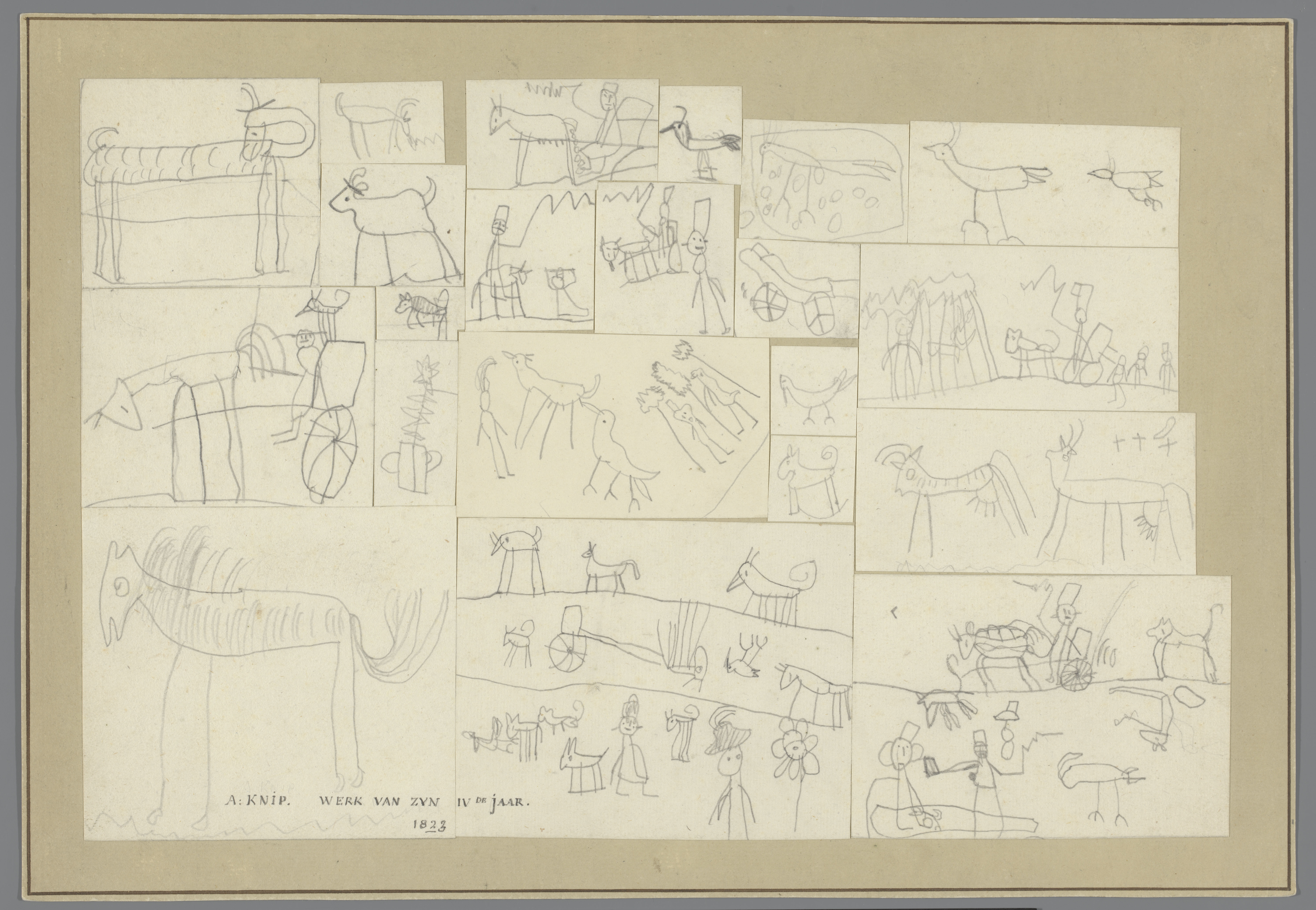 Karton waarop 43 kindertekeningen van dieren en mens...