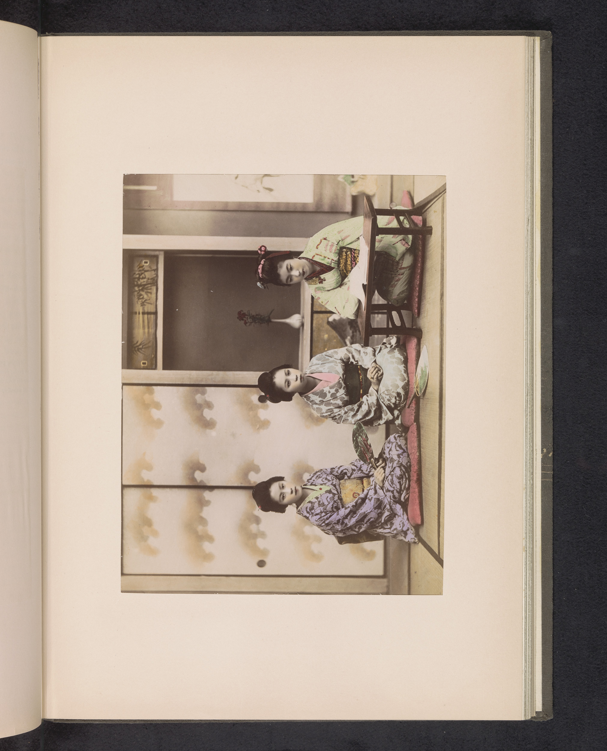 Drie zittende geisha's in een interieur