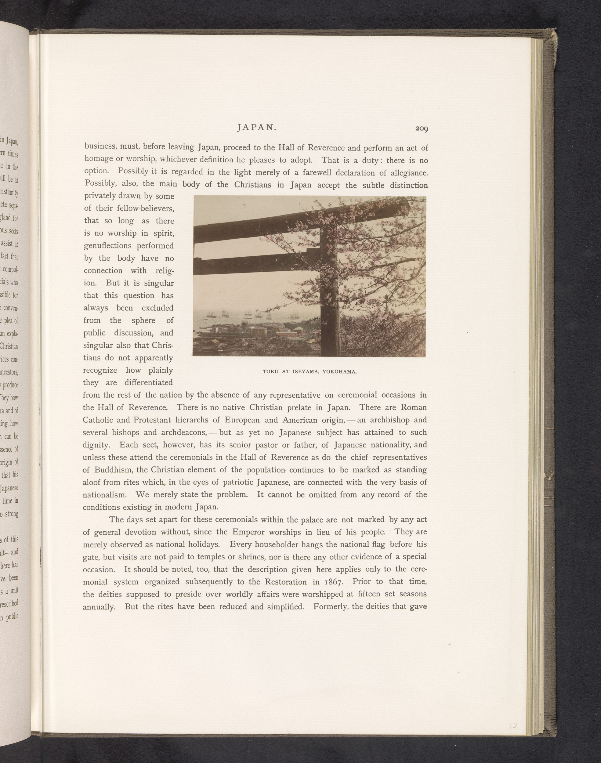 Toegangspoort (torii) met kersenbloesem, met op de a...