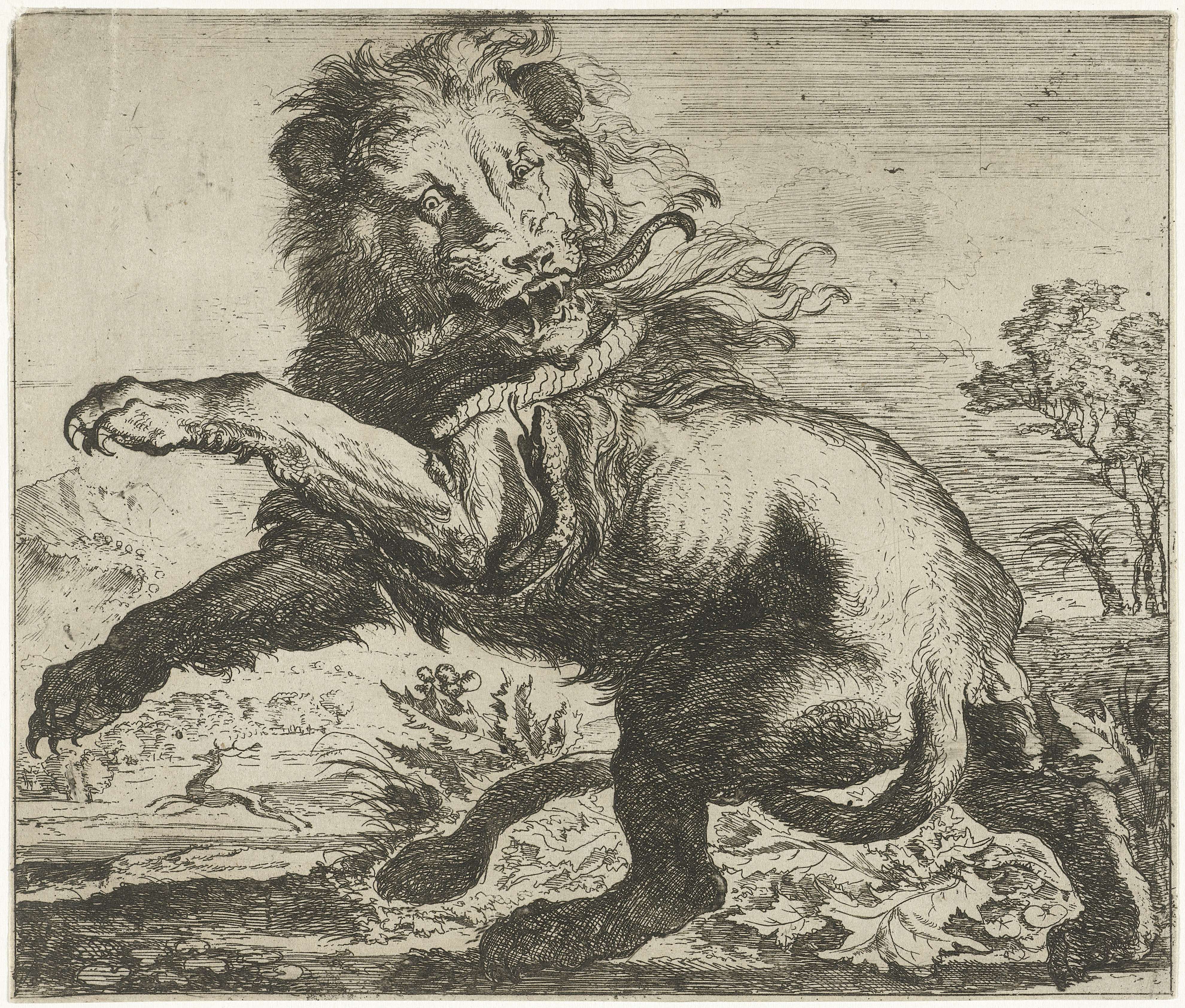 Leeuw en slang in gevecht