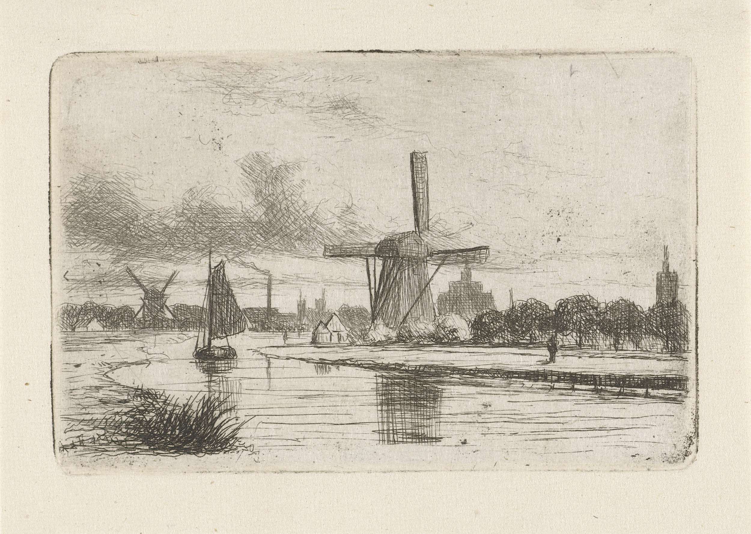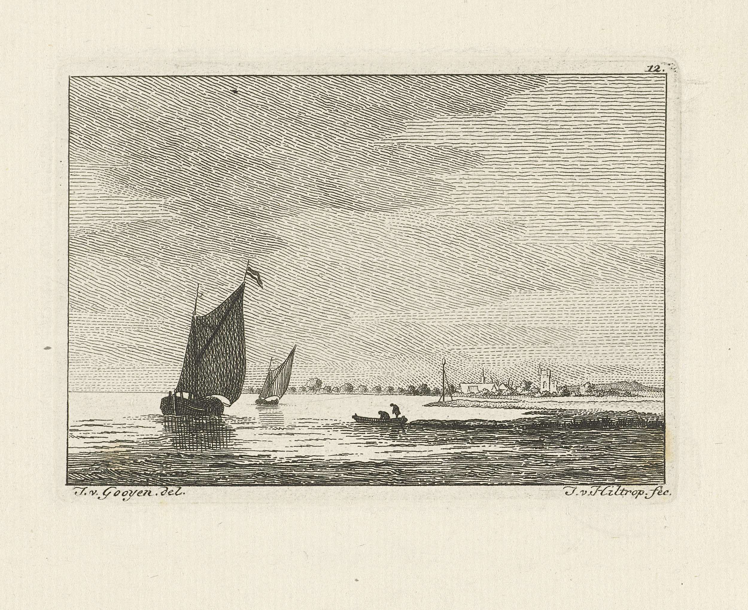 Riviergezicht met zeilschepen en een sloep