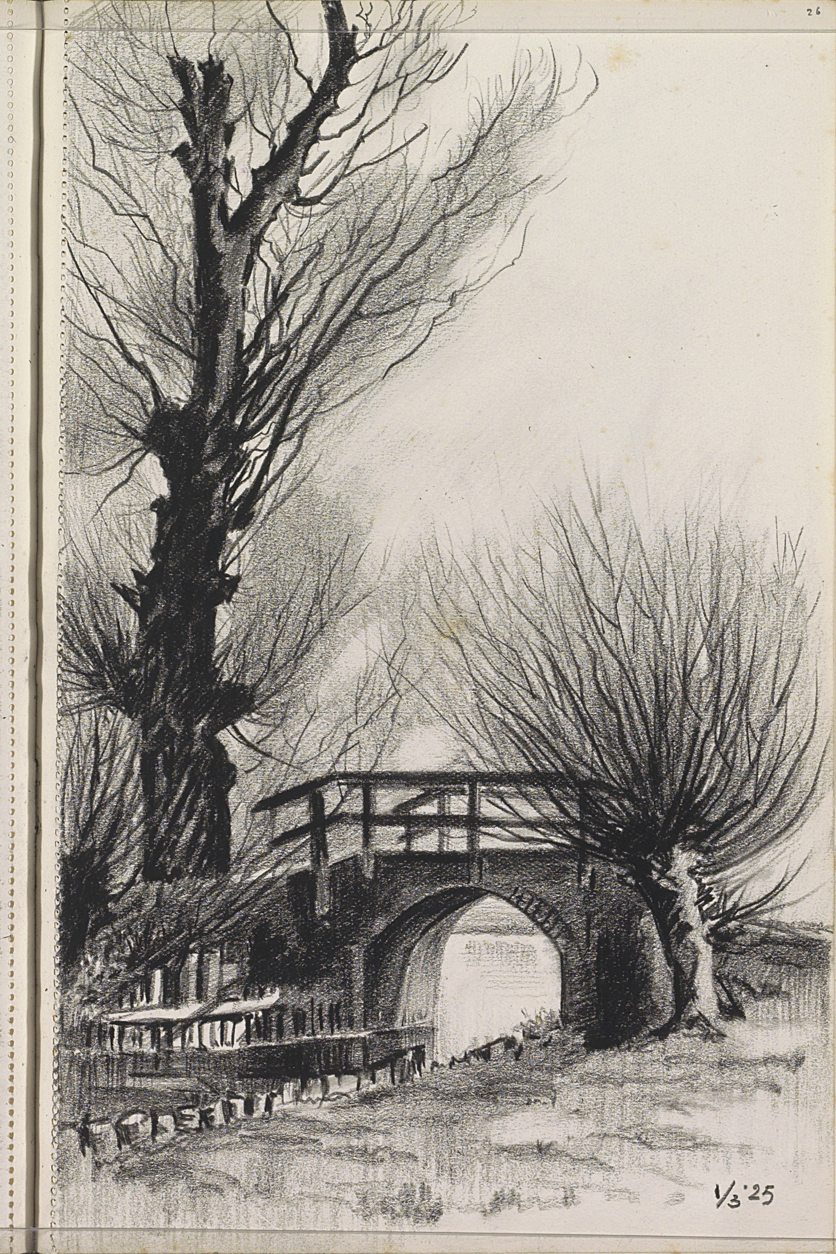 Gezicht op een waterkant met een brug en wilg