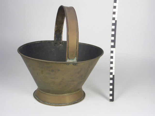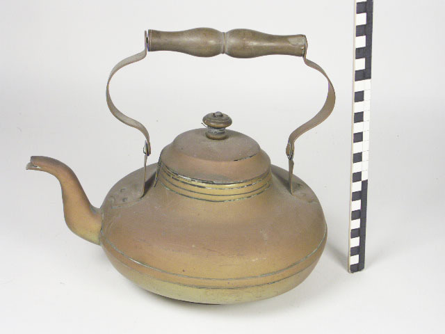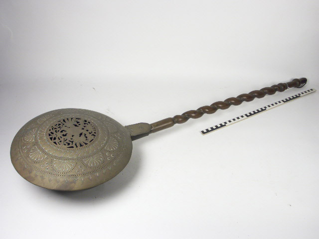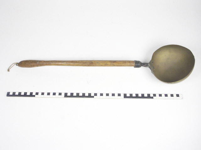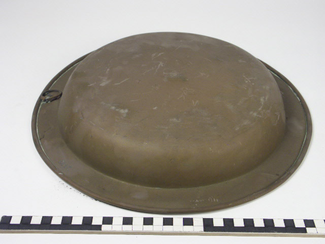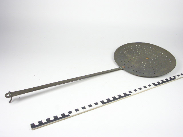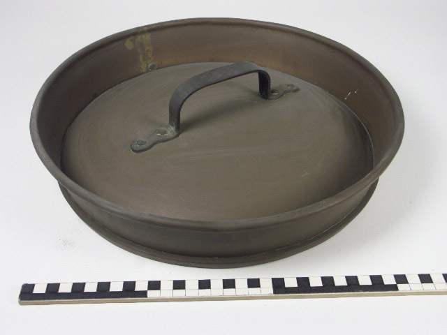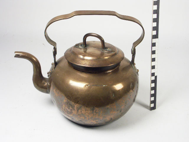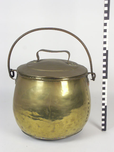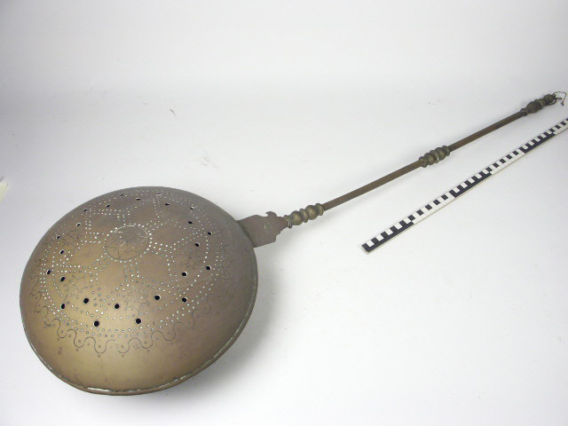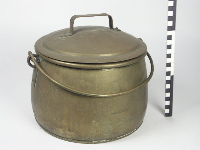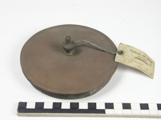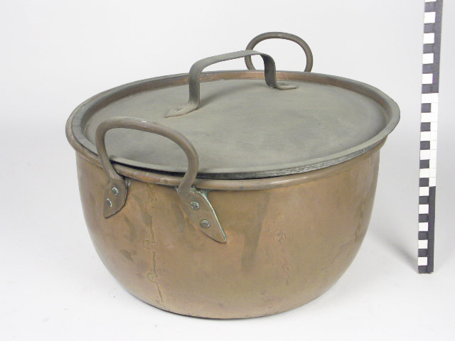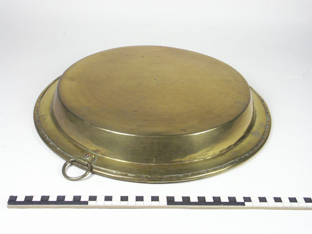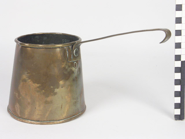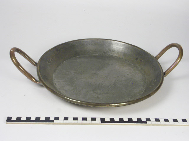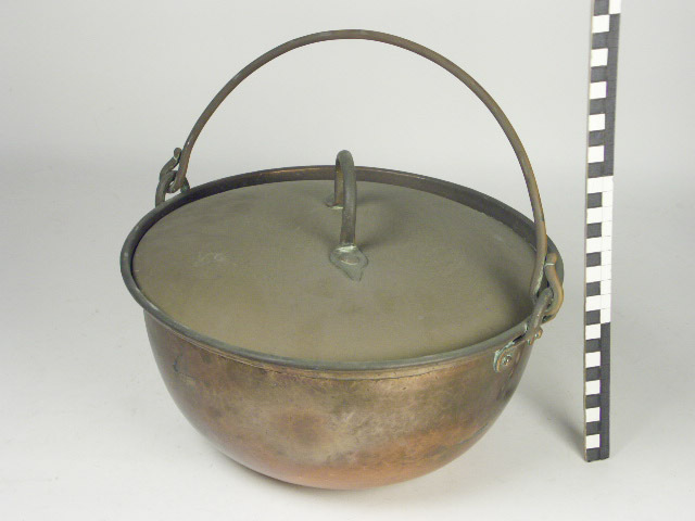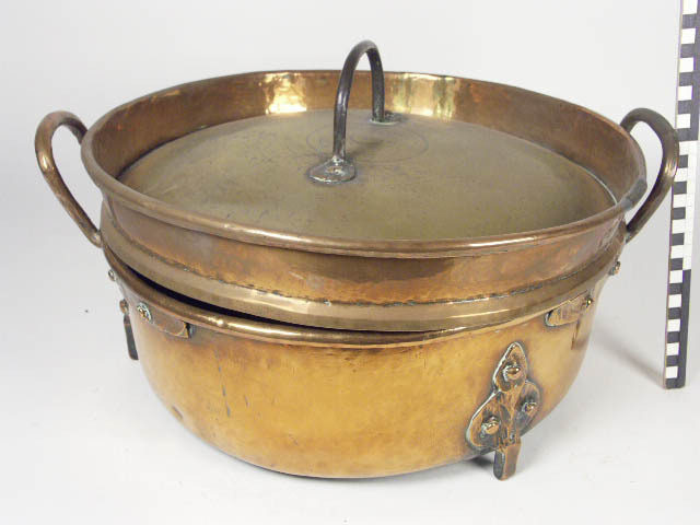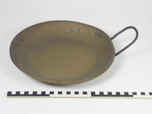 Roodkoperen ronde vleespan met gebogen geelkoperen h...