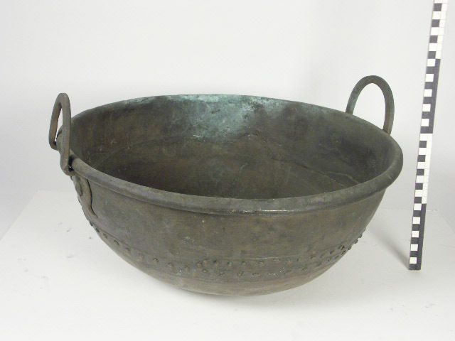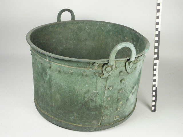 Twee koperen wasketels 1) op ijzeren onderstel met 3...