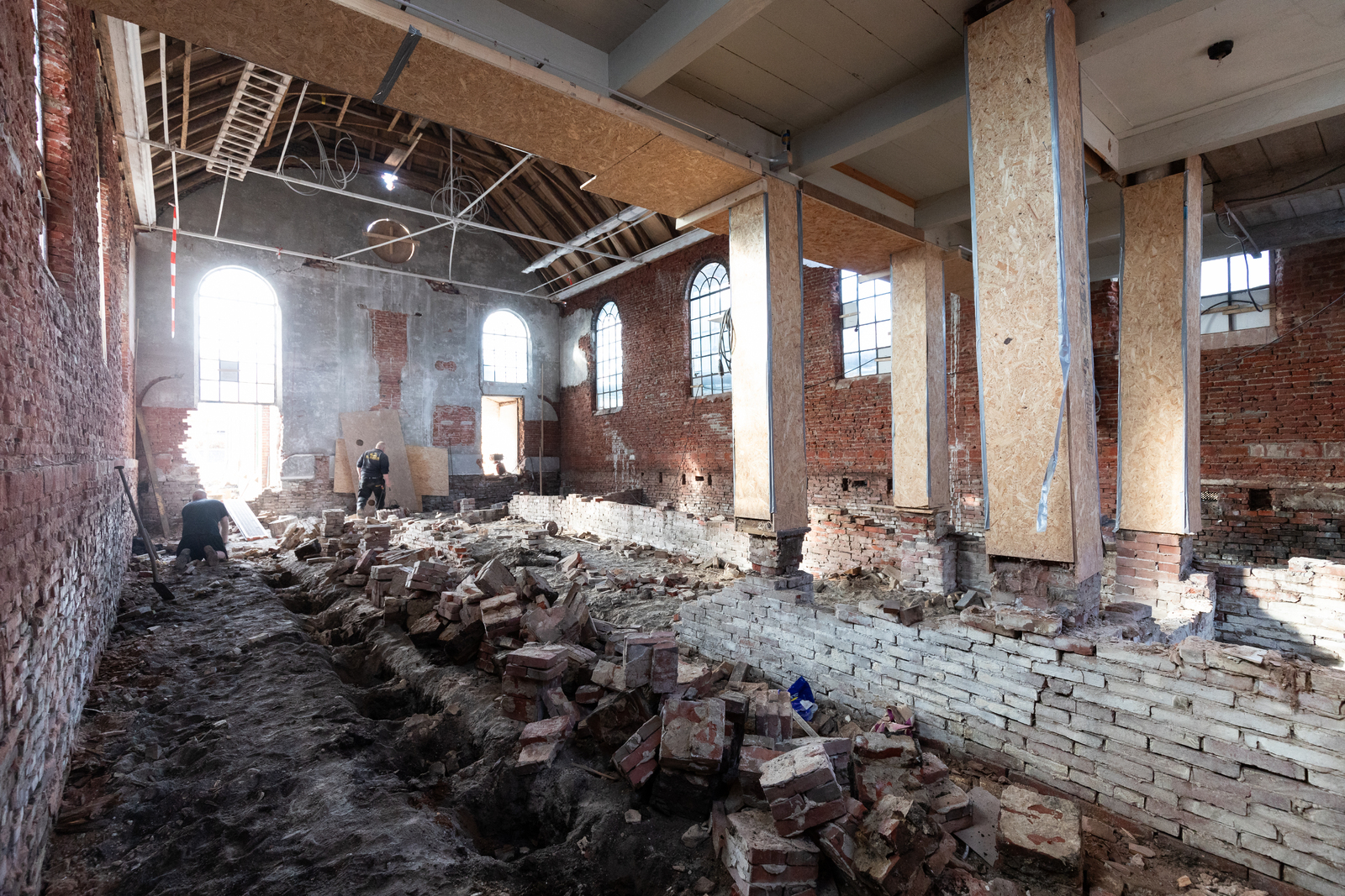 Funderingswerkzaamheden, met omhoog gevijzelde kerk