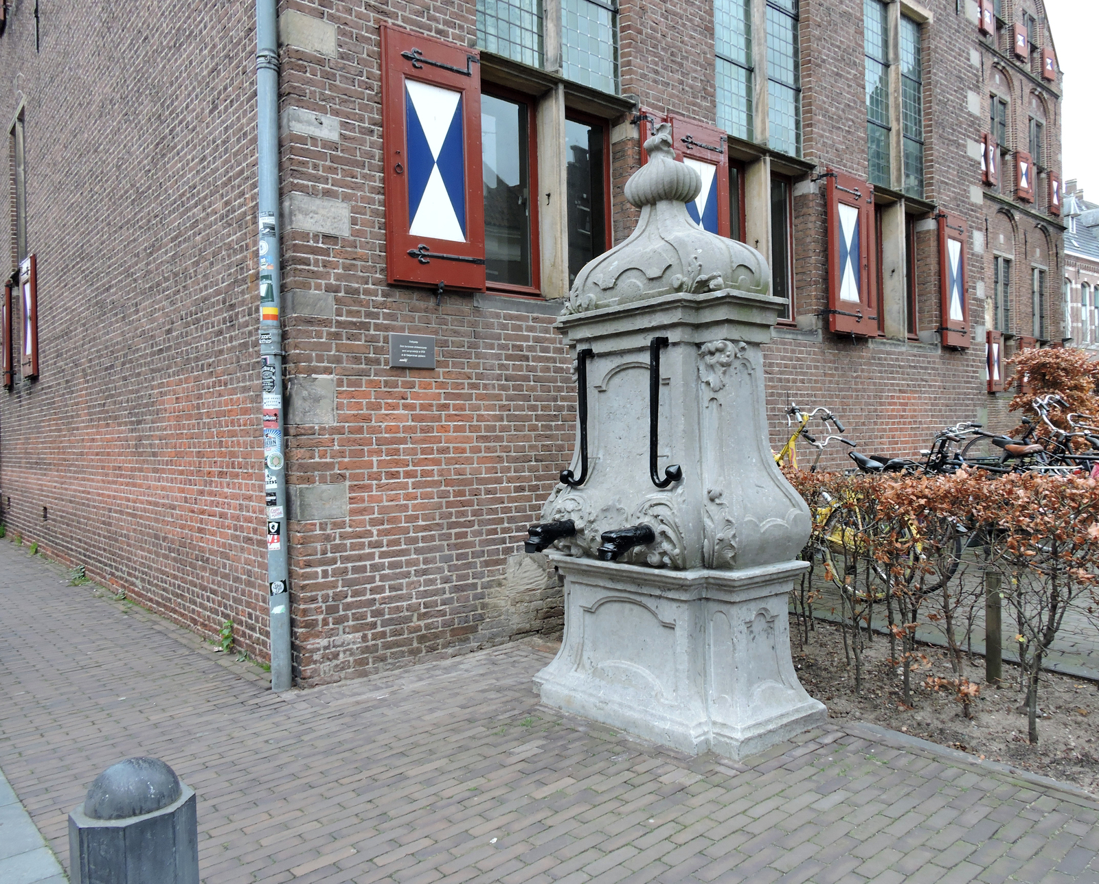Gebeeldhouwde hardstenen stadspomp met twee zwengels...