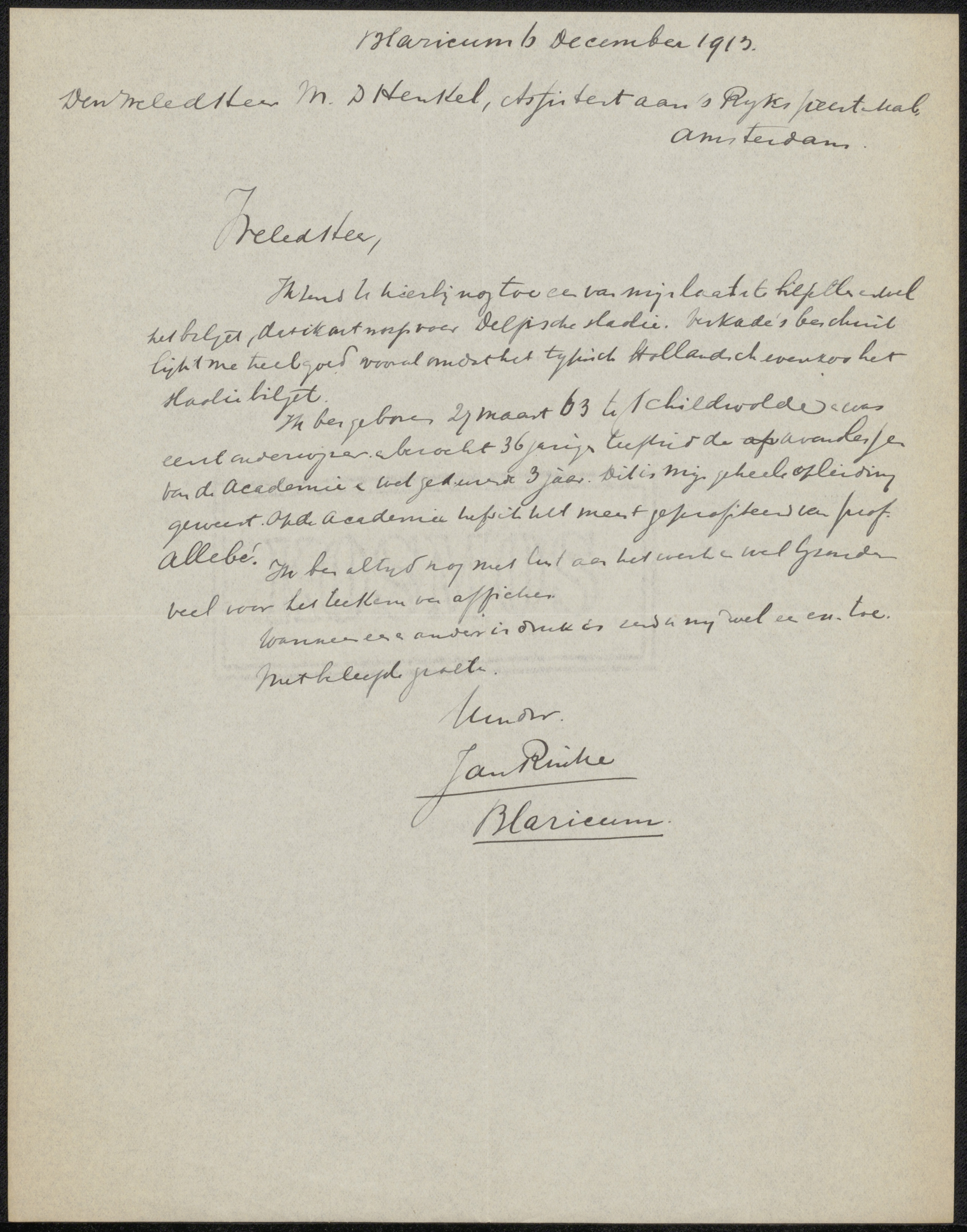 Brief aan Jacob Jan van der Maaten