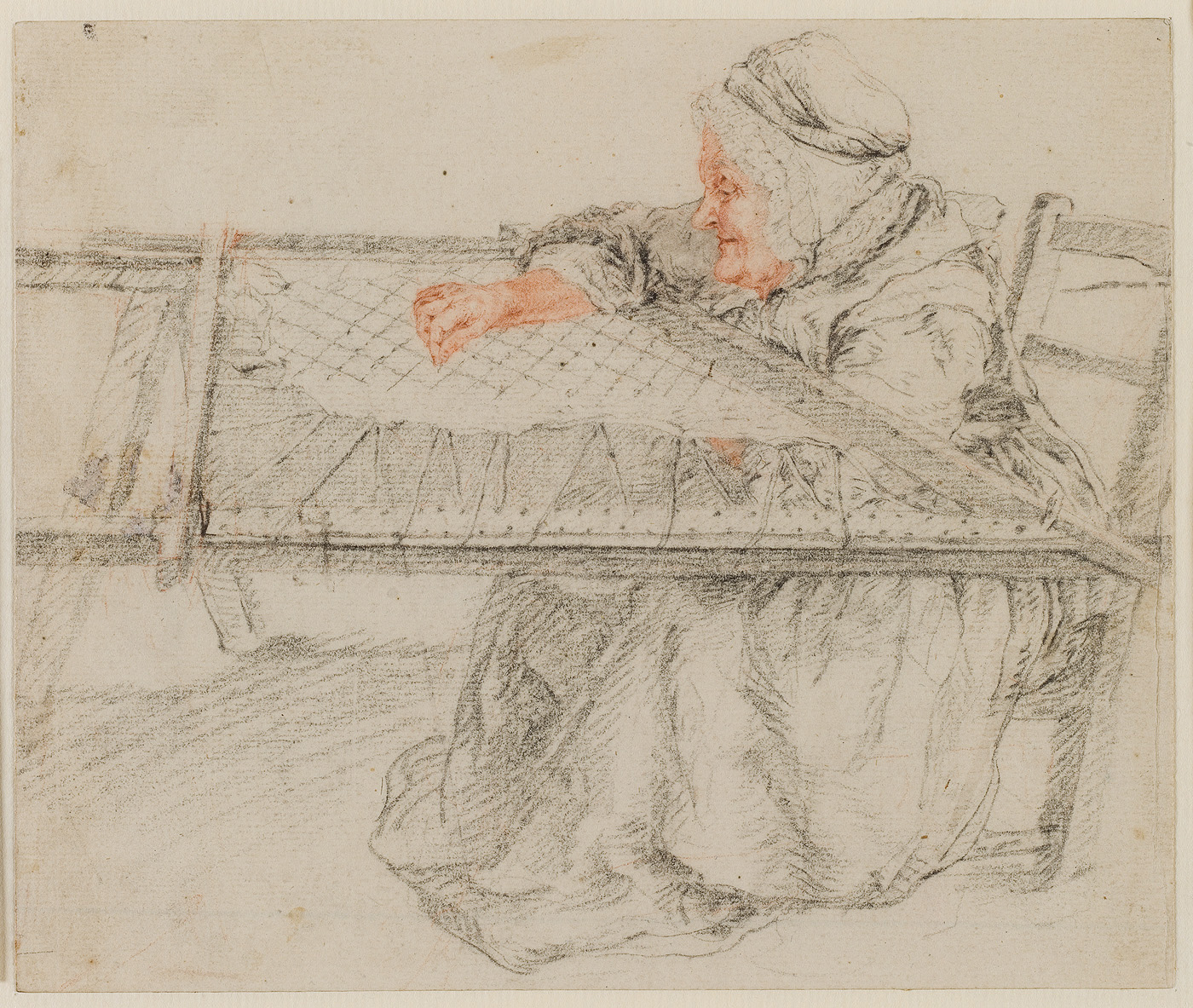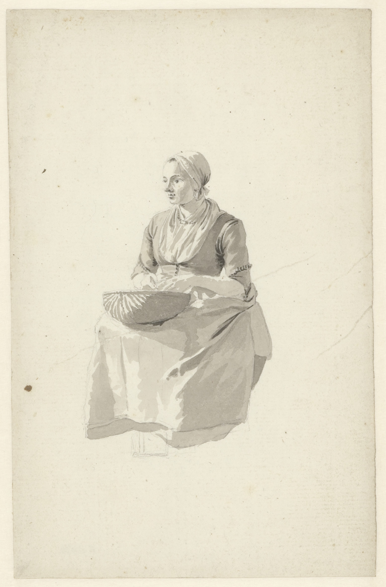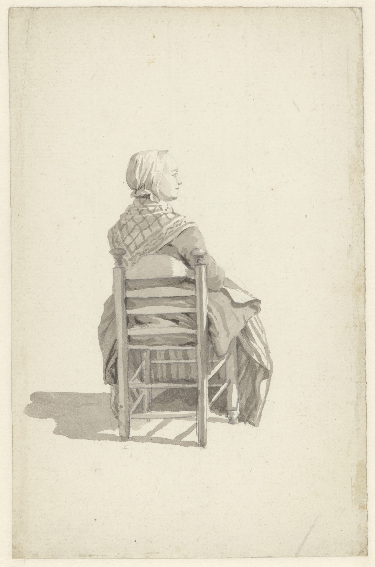 Zittende Romeinsche vrouw in roode jurk met een doek...