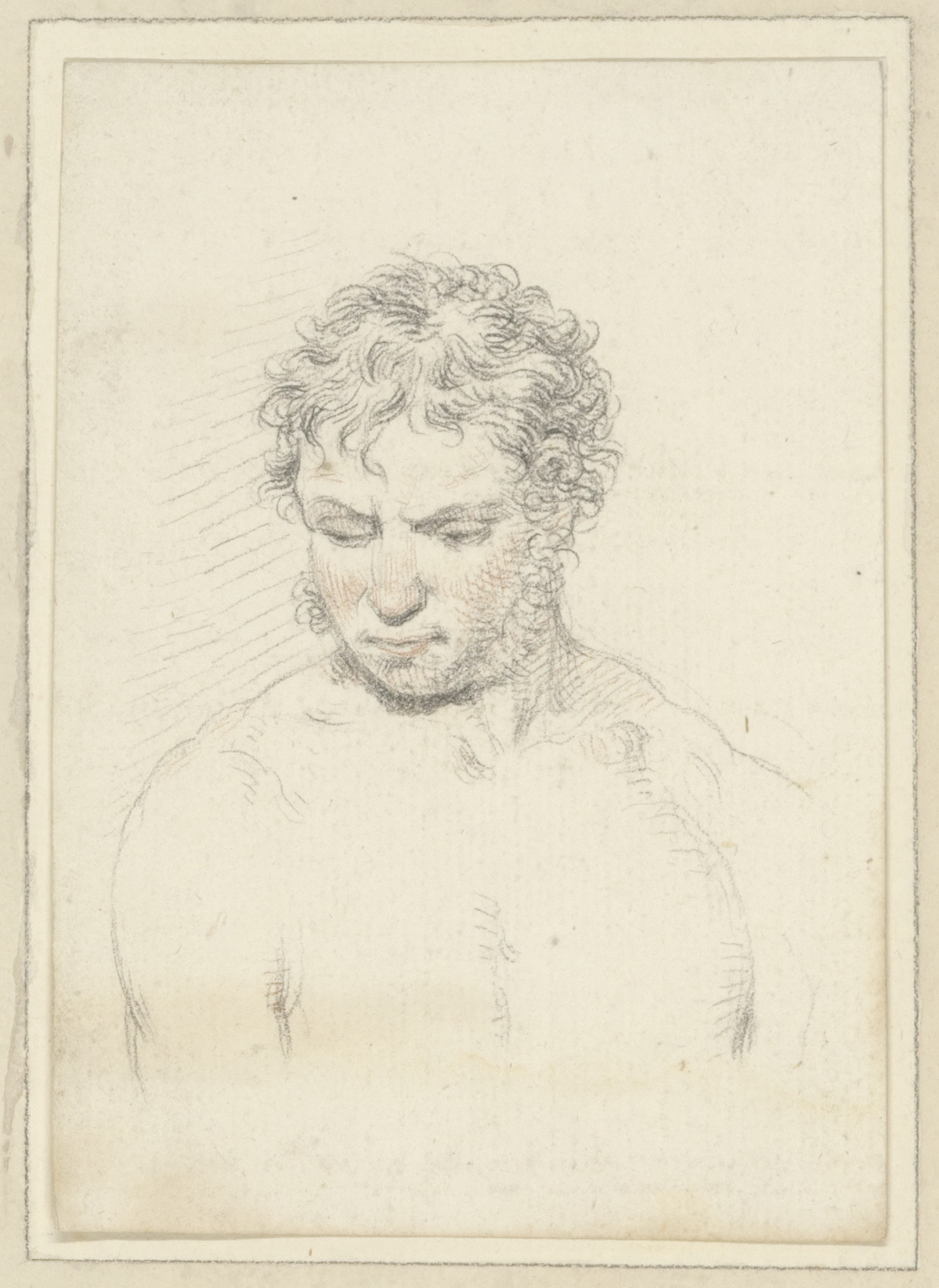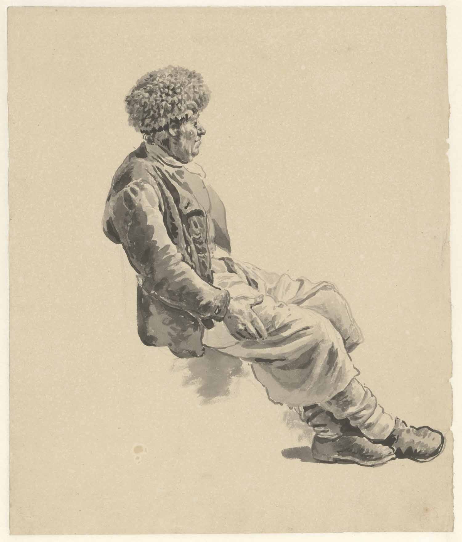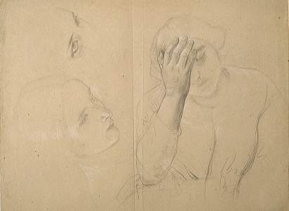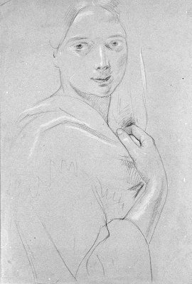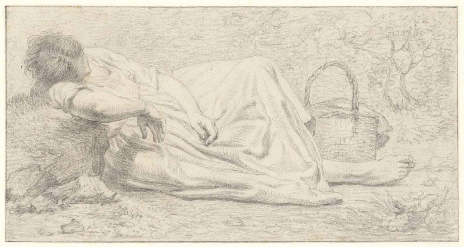Zittende Romeinsche vrouw in roode jurk met een doek...