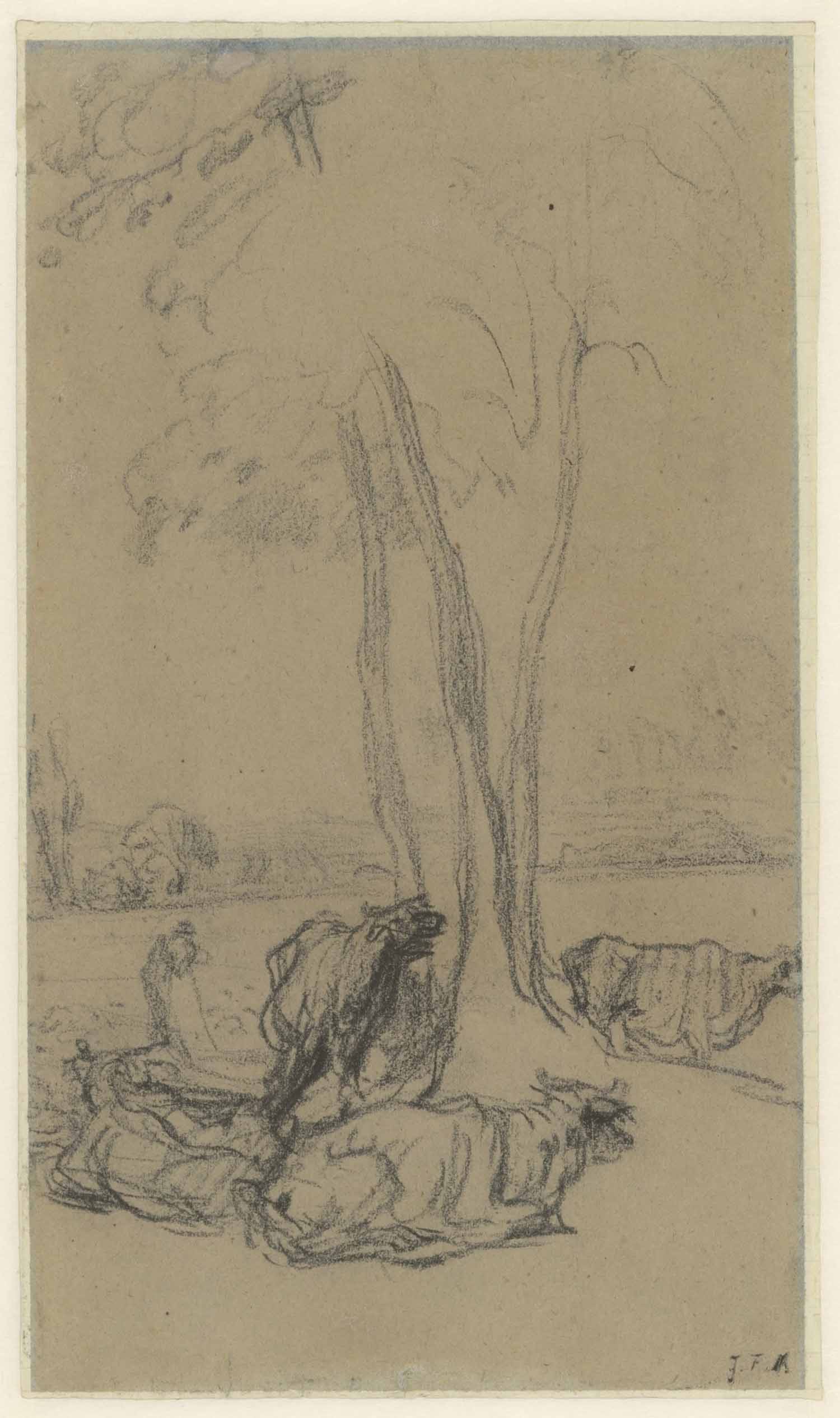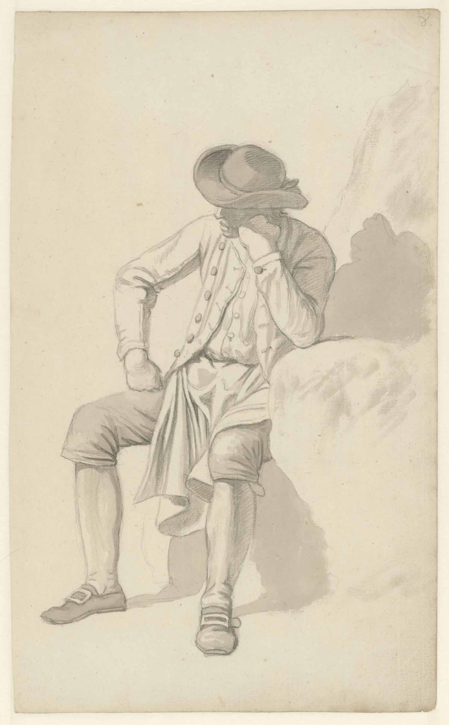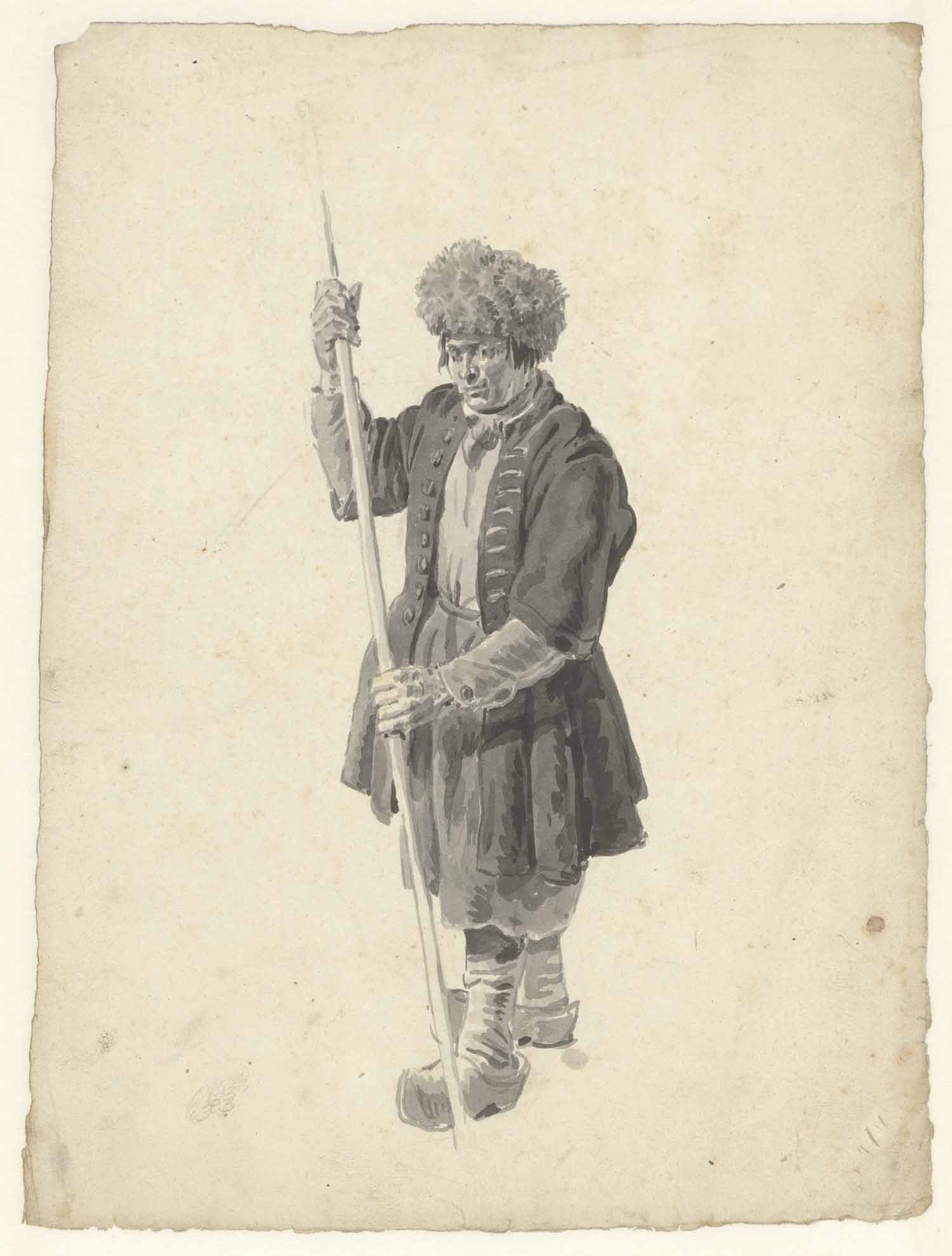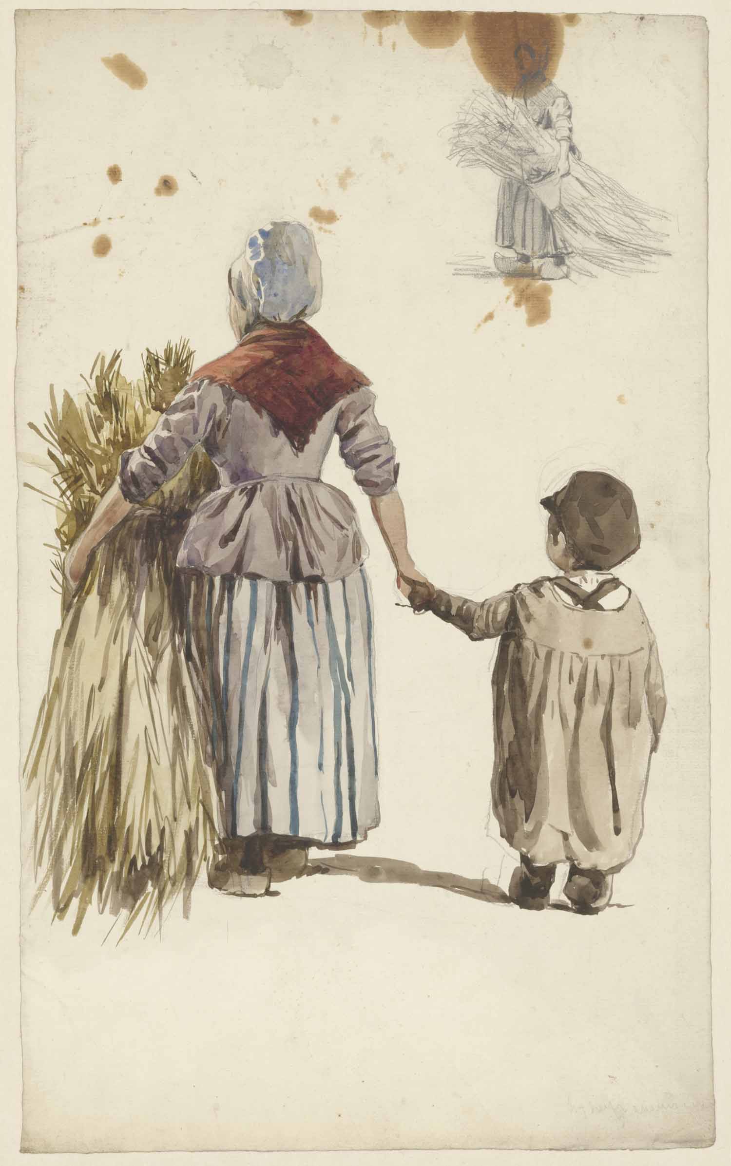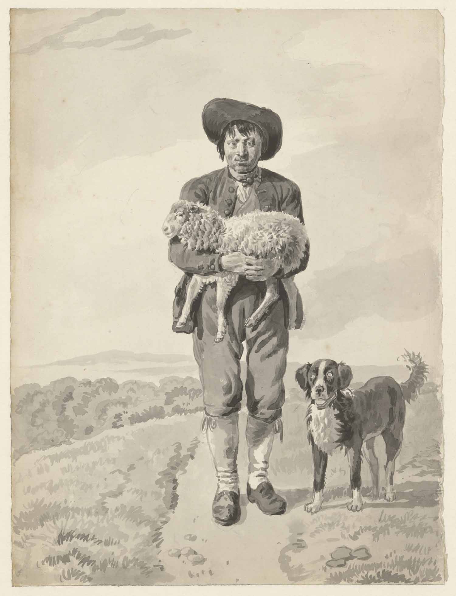 Boer, een lammetje dragend, met zijn hond, in landschap