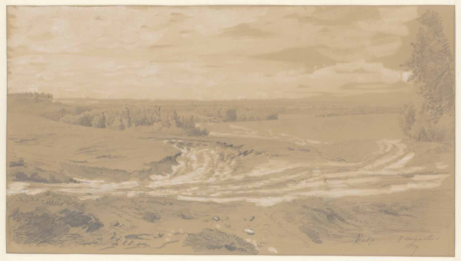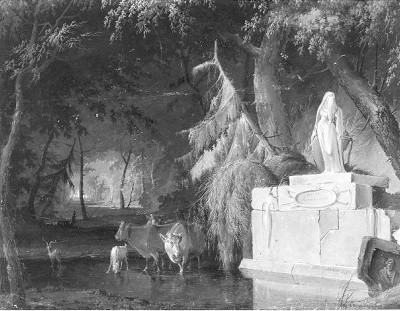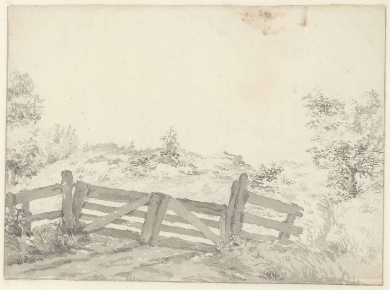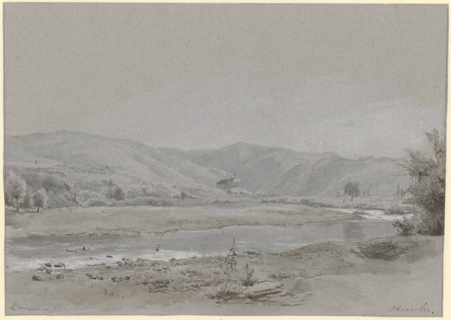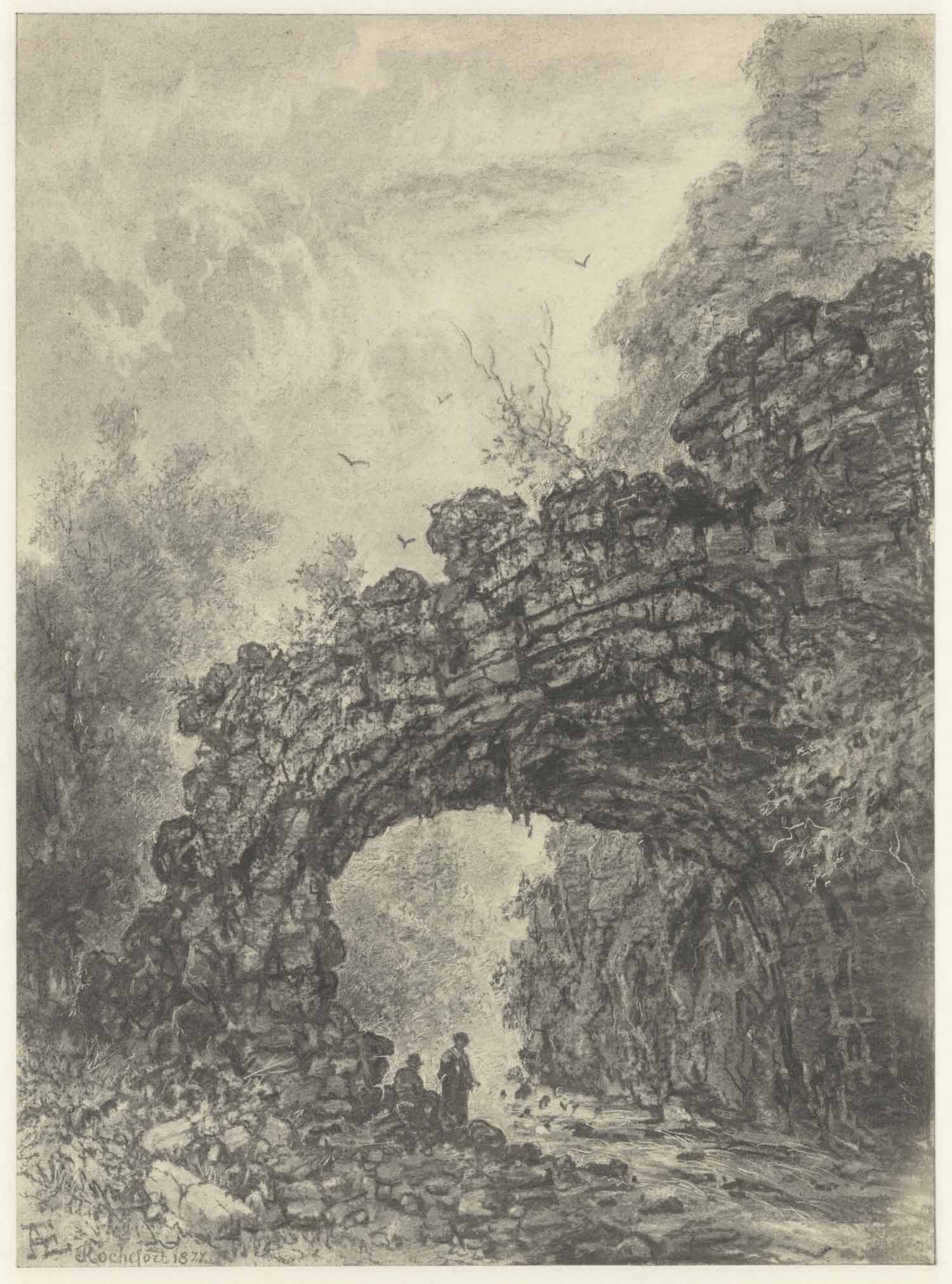 Boer, een lammetje dragend, met zijn hond, in landschap