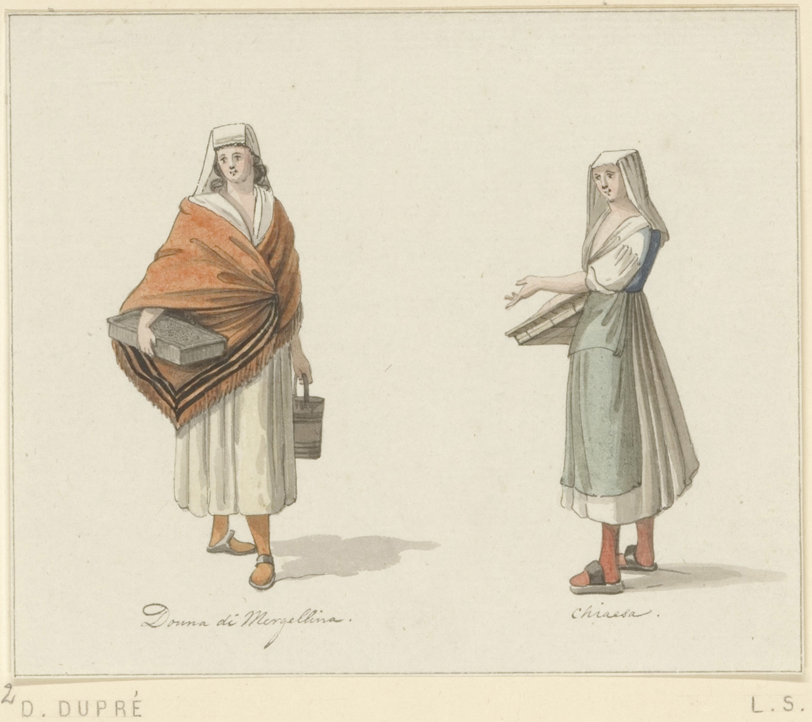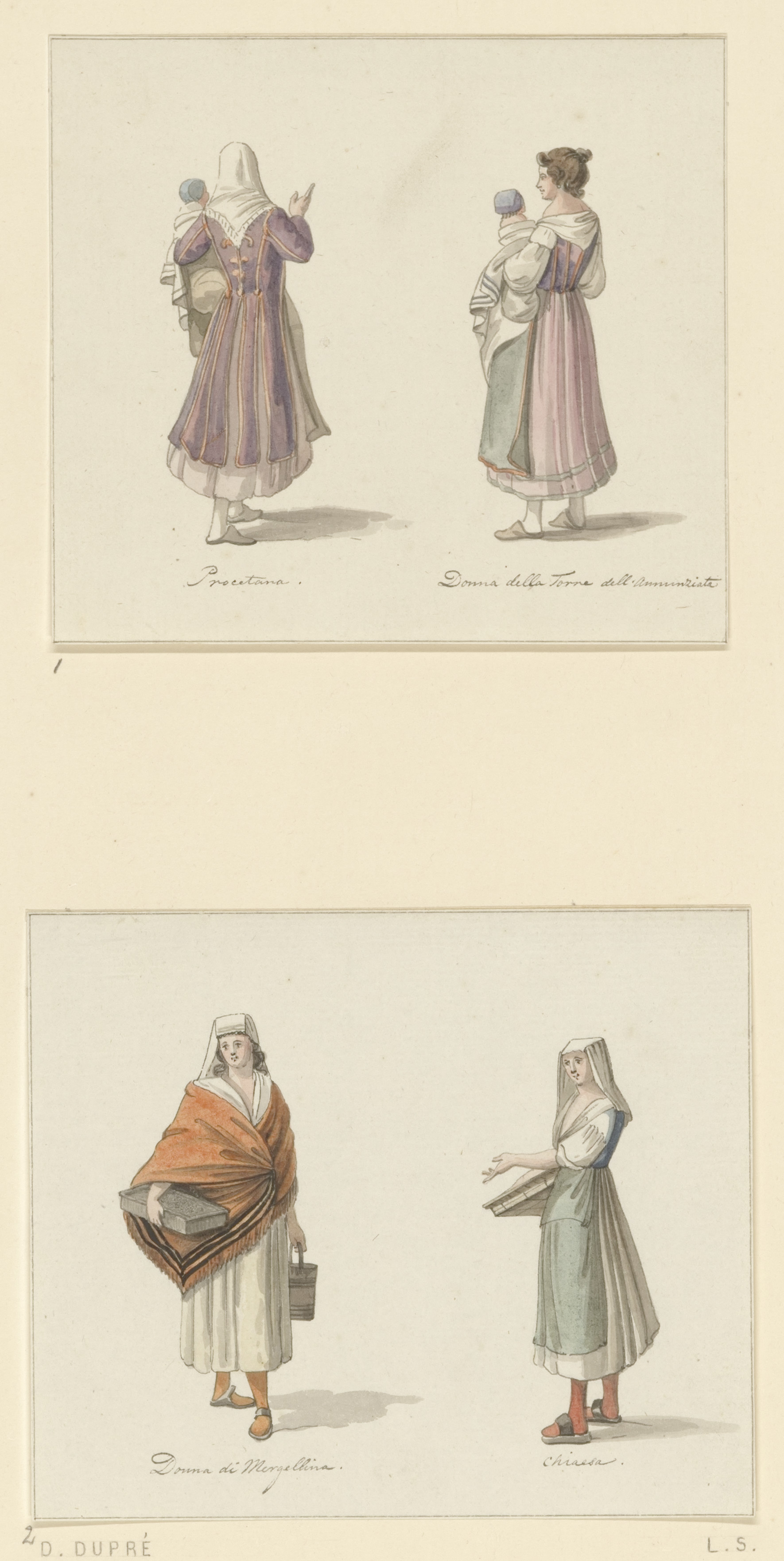 Italiaansche costumen: 'Donna di Mergellina', 'Chiaesa'