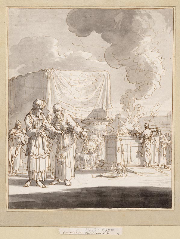 Achan, van diefstal overtuigd, knielt voor Jozua