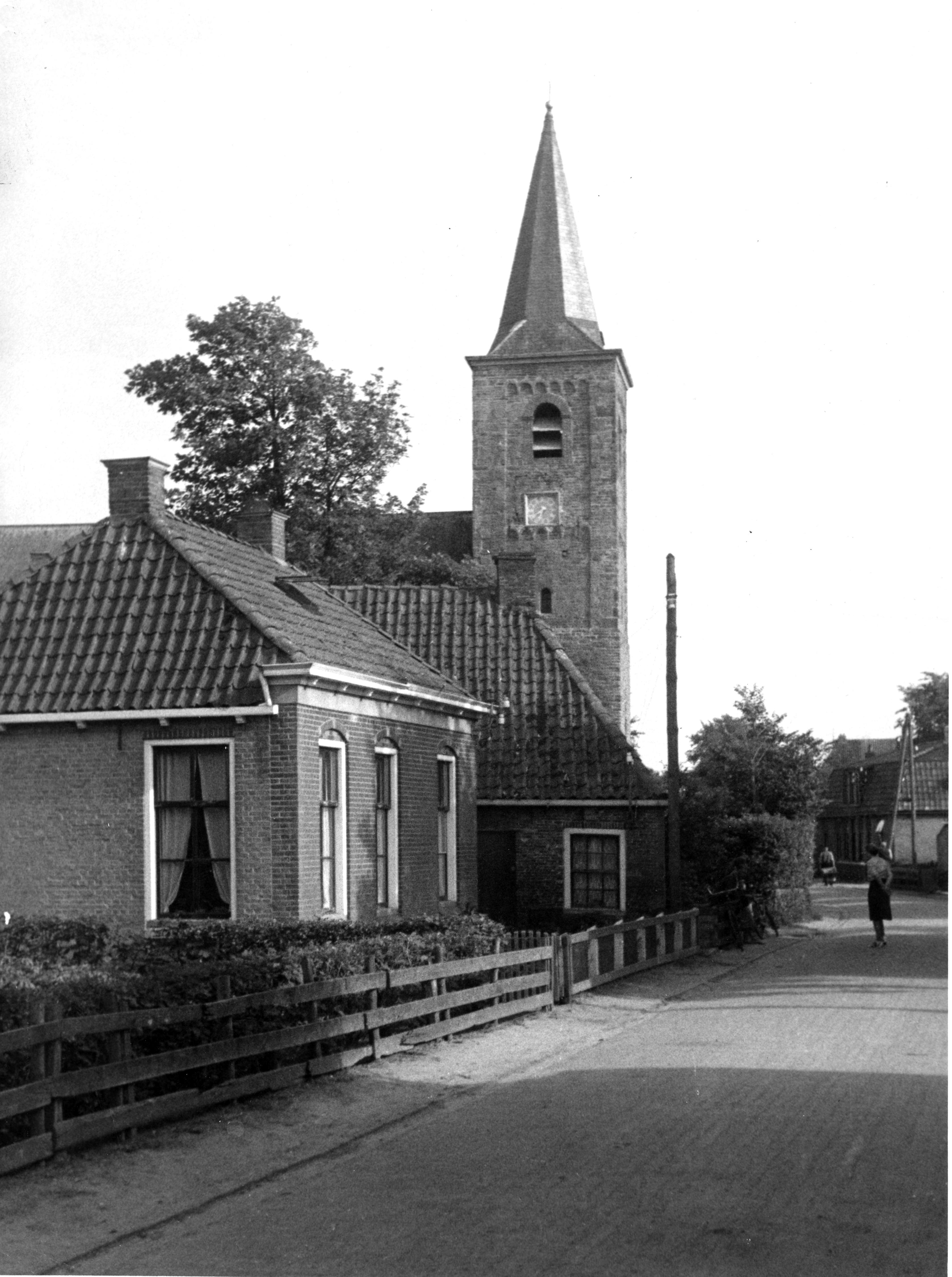 Arbeiderswoningen en kerk, Warns, 1942 (zwart-wit foto)