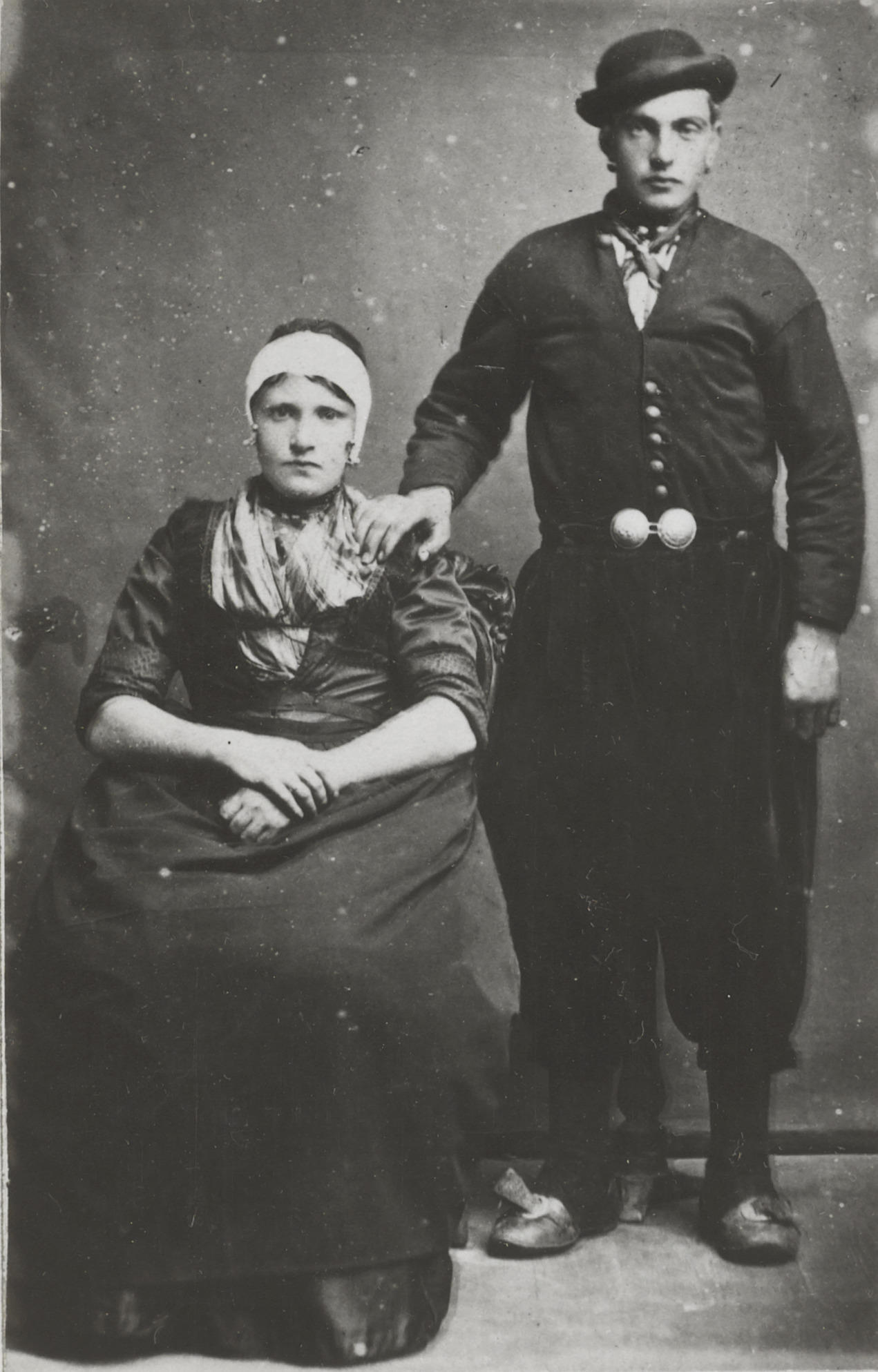 Vrouw en man in Urker streekdracht, 1885–1890 (zwart...