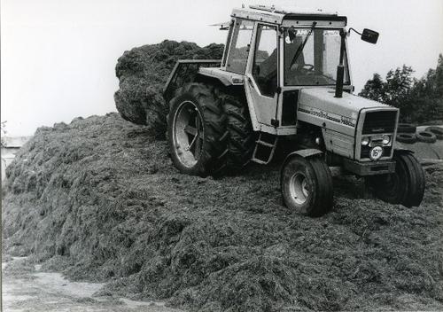 Foto in zwart-wit van het laden van bietenloof op ee...
