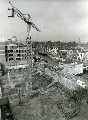 Foto in zwart-wit van de bouw van het kantoorgebouw ...