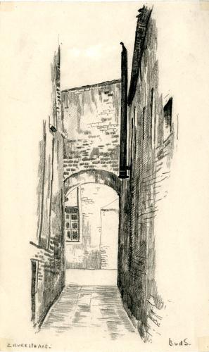 Tekening met potlood van een steeg in de Zilverstraa...