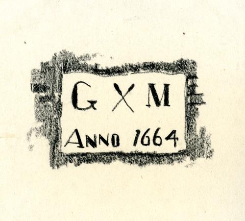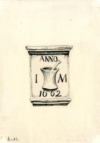 Tekening met potlood van een gevelsteen met een vijz...