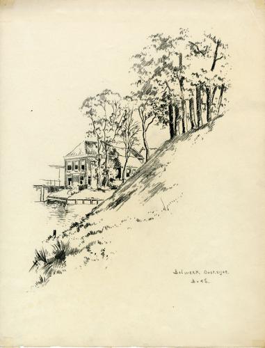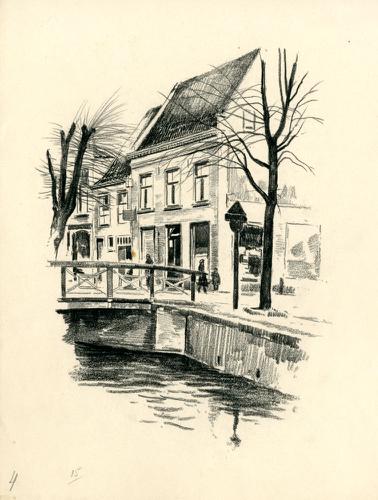 Tekening met potlood van een gracht in Franeker met ...