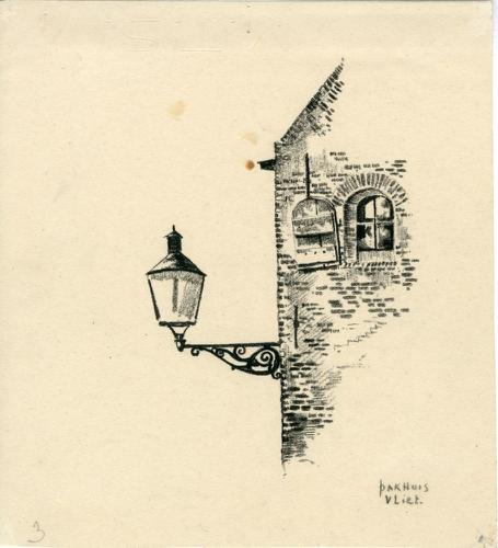 Tekening met potlood van een lantaarn aan een pakhui...