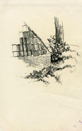 Tekening met potlood van een detail van een huis doo...
