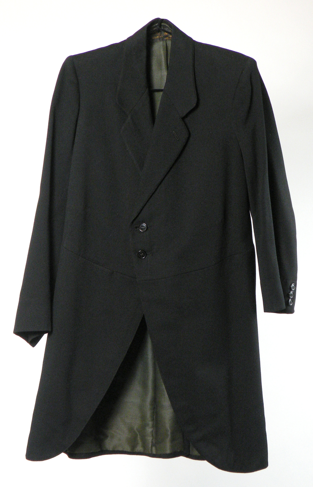 Lange overjas van zwart laken, gebruikt als uitvaartjas