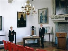 Burgemeester Van der Zwaag en bode Ria Hettich in de...
